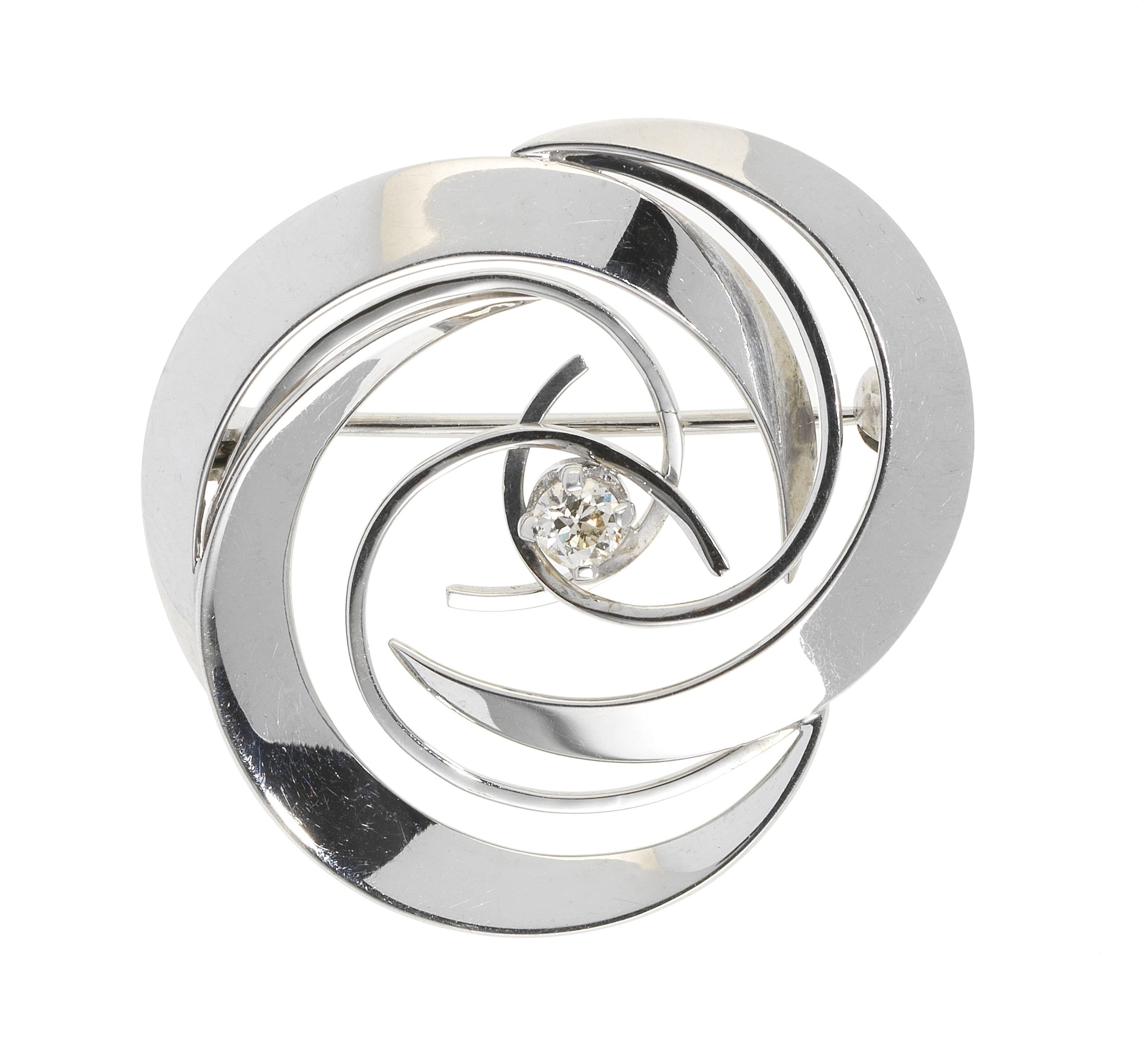 3293. Broche circulaire ajourée centrée d'un diamant taille ancienne (env. 0,15 ct)