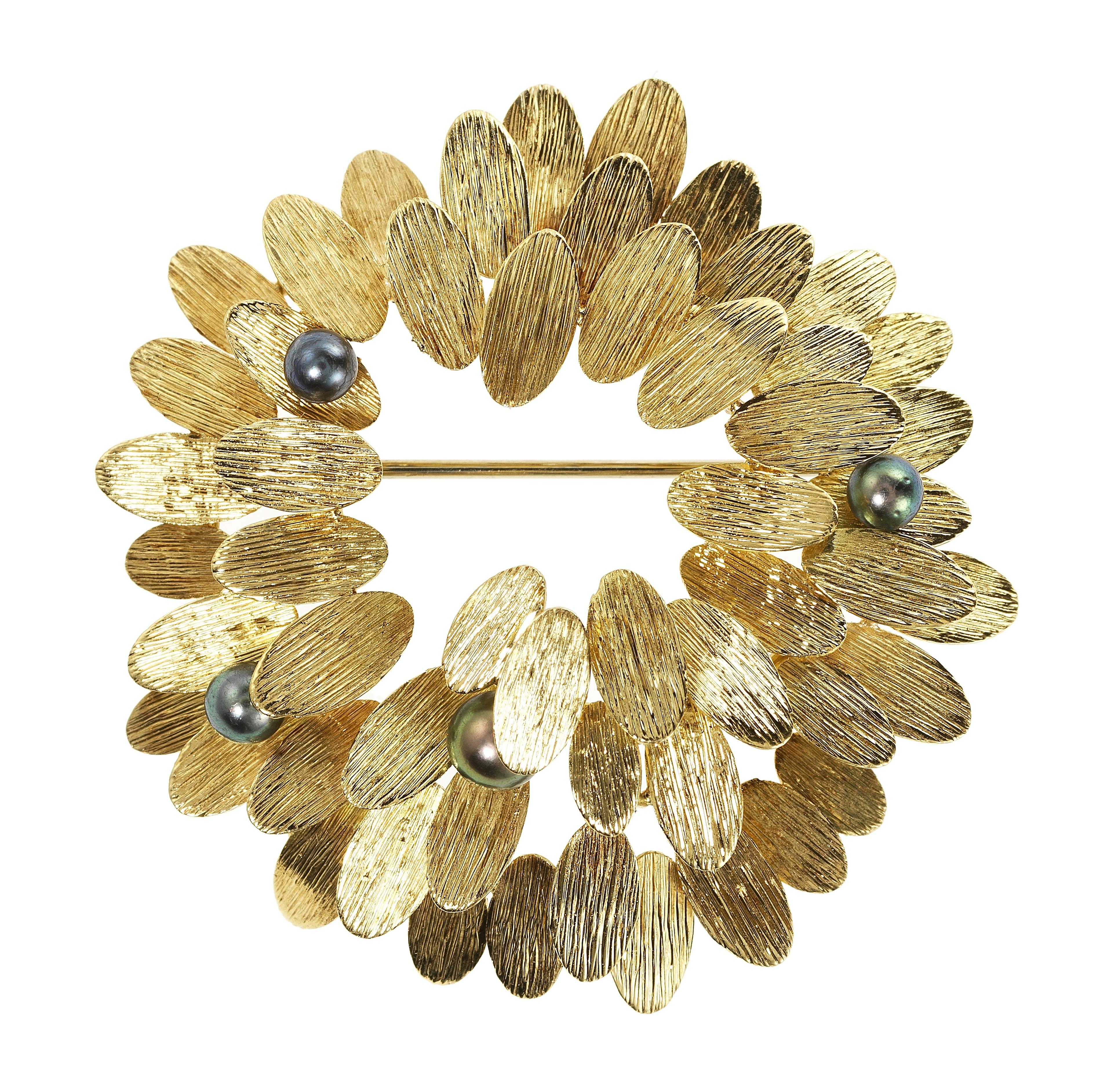 3325. Broche circulaire stylisée en or brossé sertie de petites perles grises