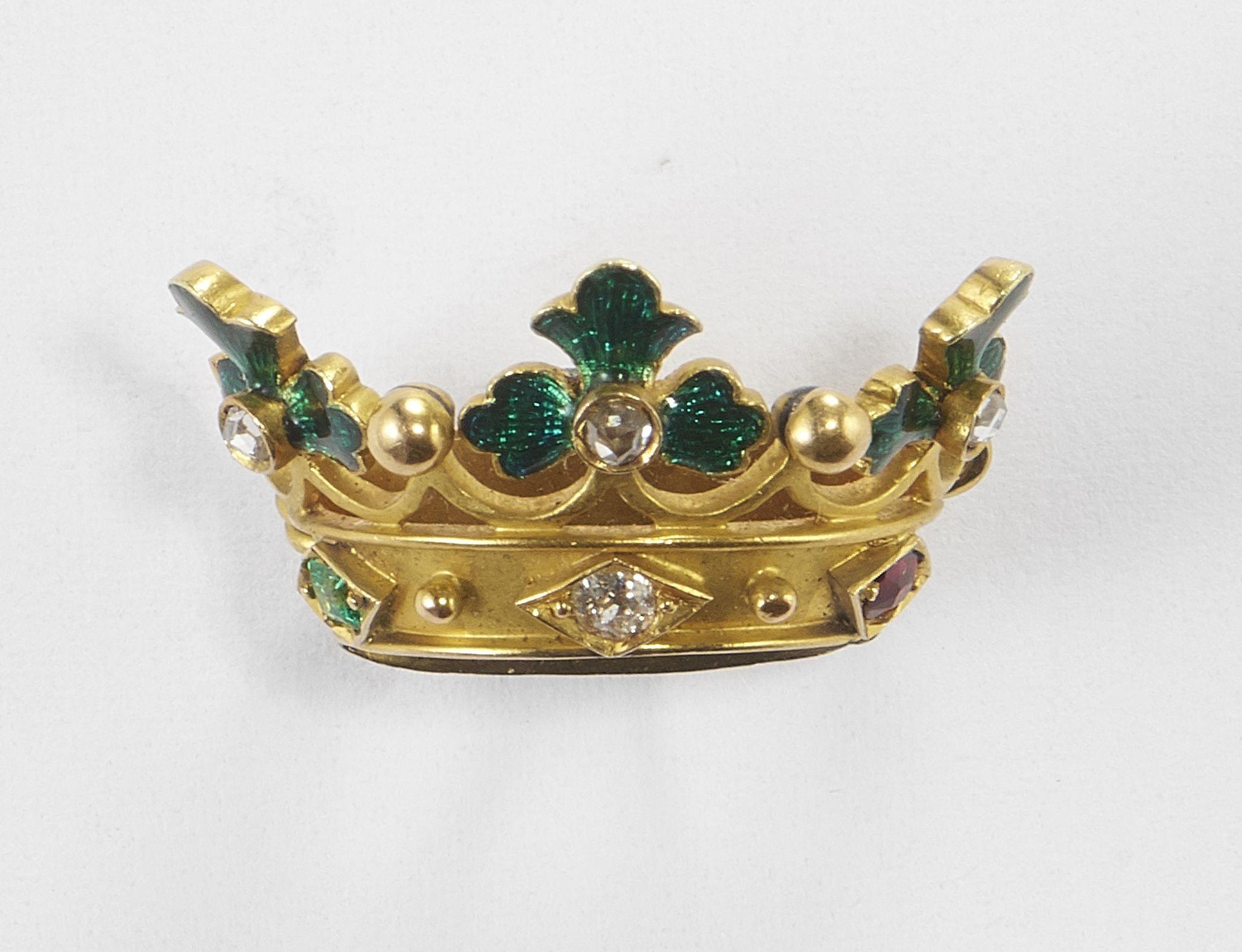 3147. Broche de médaille à motif de couronne émaillée, sertie de diamant, d'un rubis et d'une émeraude
