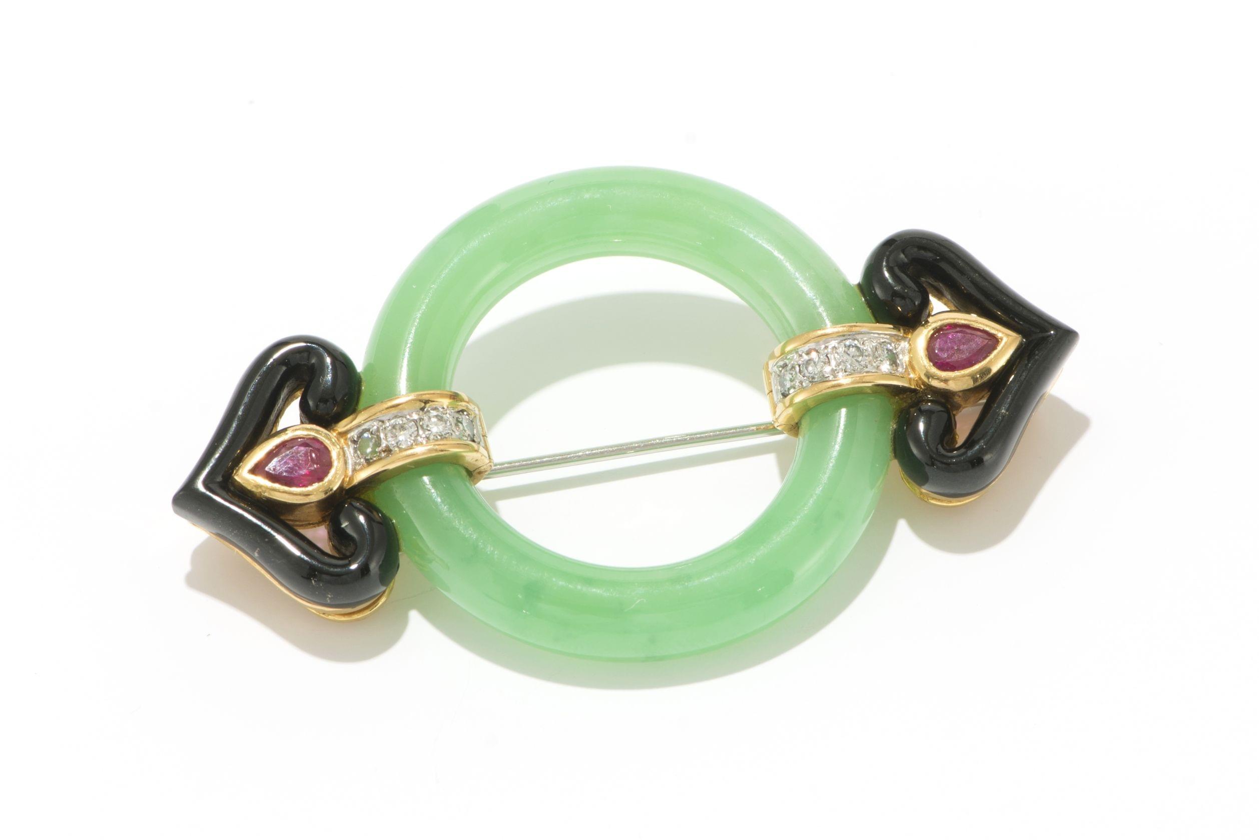 72. Broche de style Art Déco en jade et onyx sertie de diamants et rubis