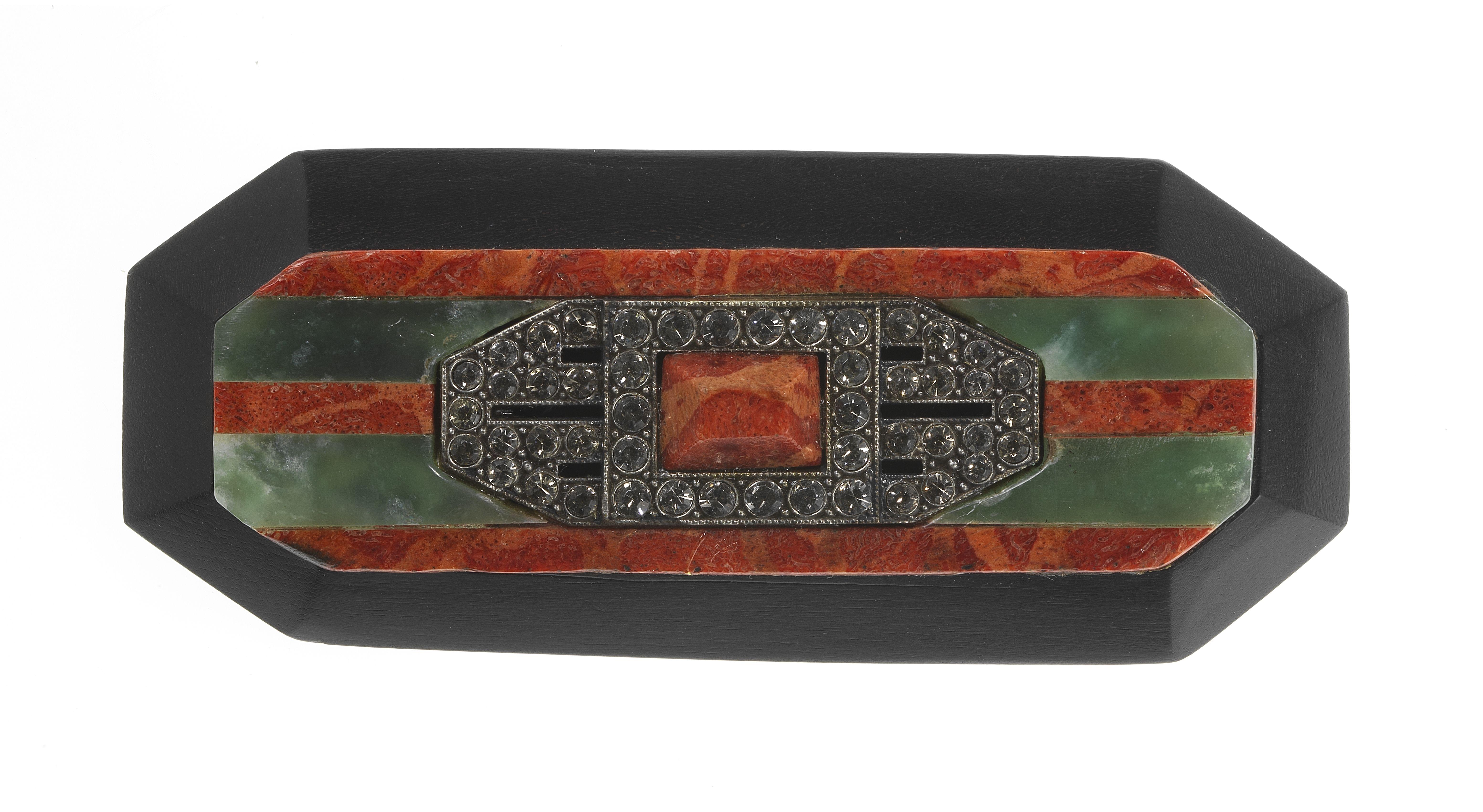 3023. Broche de style Art déco en marquetterie de pierre dure et résine, centrée d'un motif serti de pierres d'imitation pour le diamant
