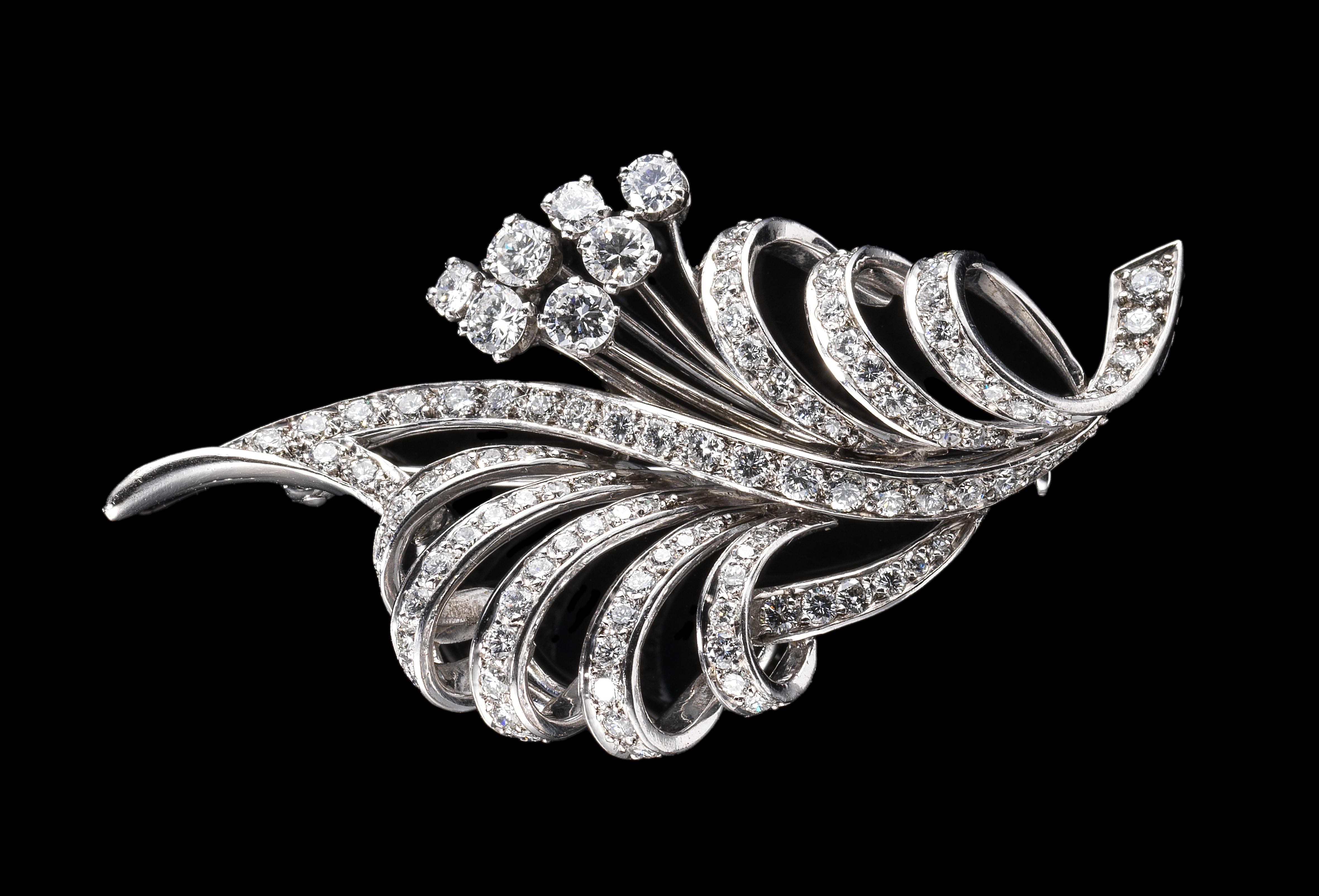 3367. Broche feuillagée ajourée à motif de volutes serties de diamants (env. 1,5 ct)