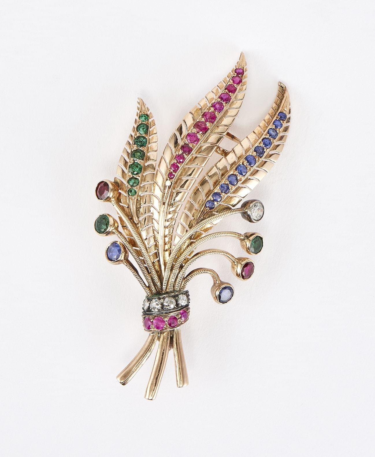 3265. Broche feuillagée sertie de saphirs, rubis, émeraudes et diamants