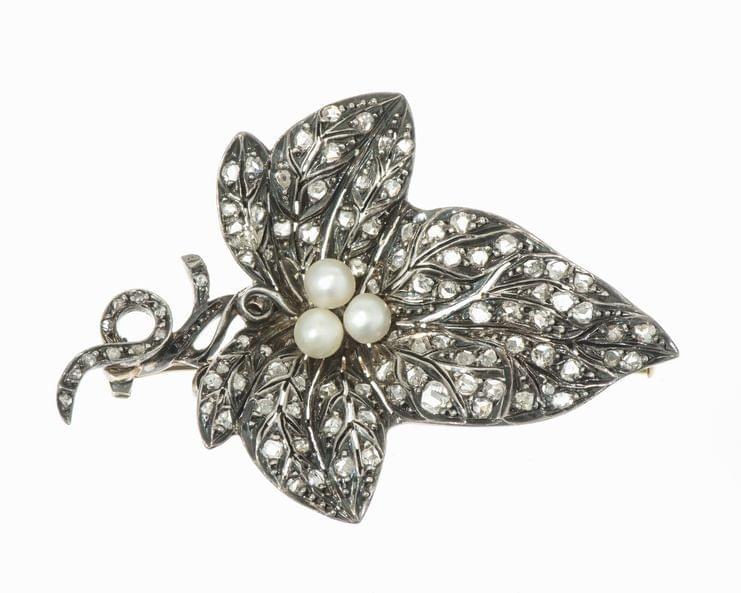 269. Broche feuille sertie de roses de diamants et de perles