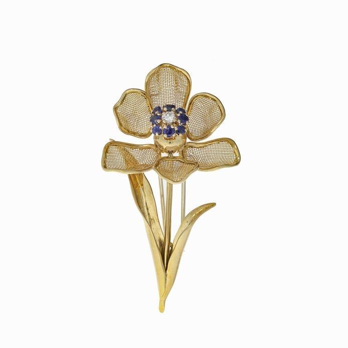 59. Broche fleur aux pétales mobiles sertie d'un diamant entouré de saphirs