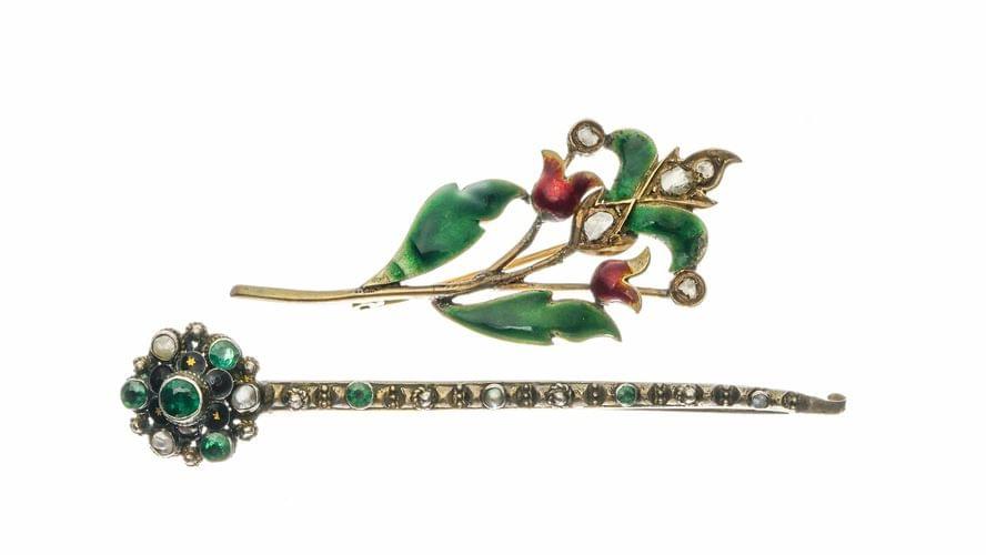 Travail ancien, or 585, H 6 cm, poids brut 8 g. On joint une broche fantaisie ancienne sertie de pierres vertes et de perles, métal, L 8 cm