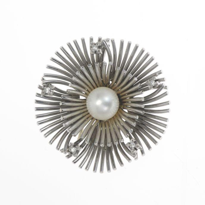 3129. Broche fleur sertie en son centre d'une perle et de 5 diamants sur l'extérieur