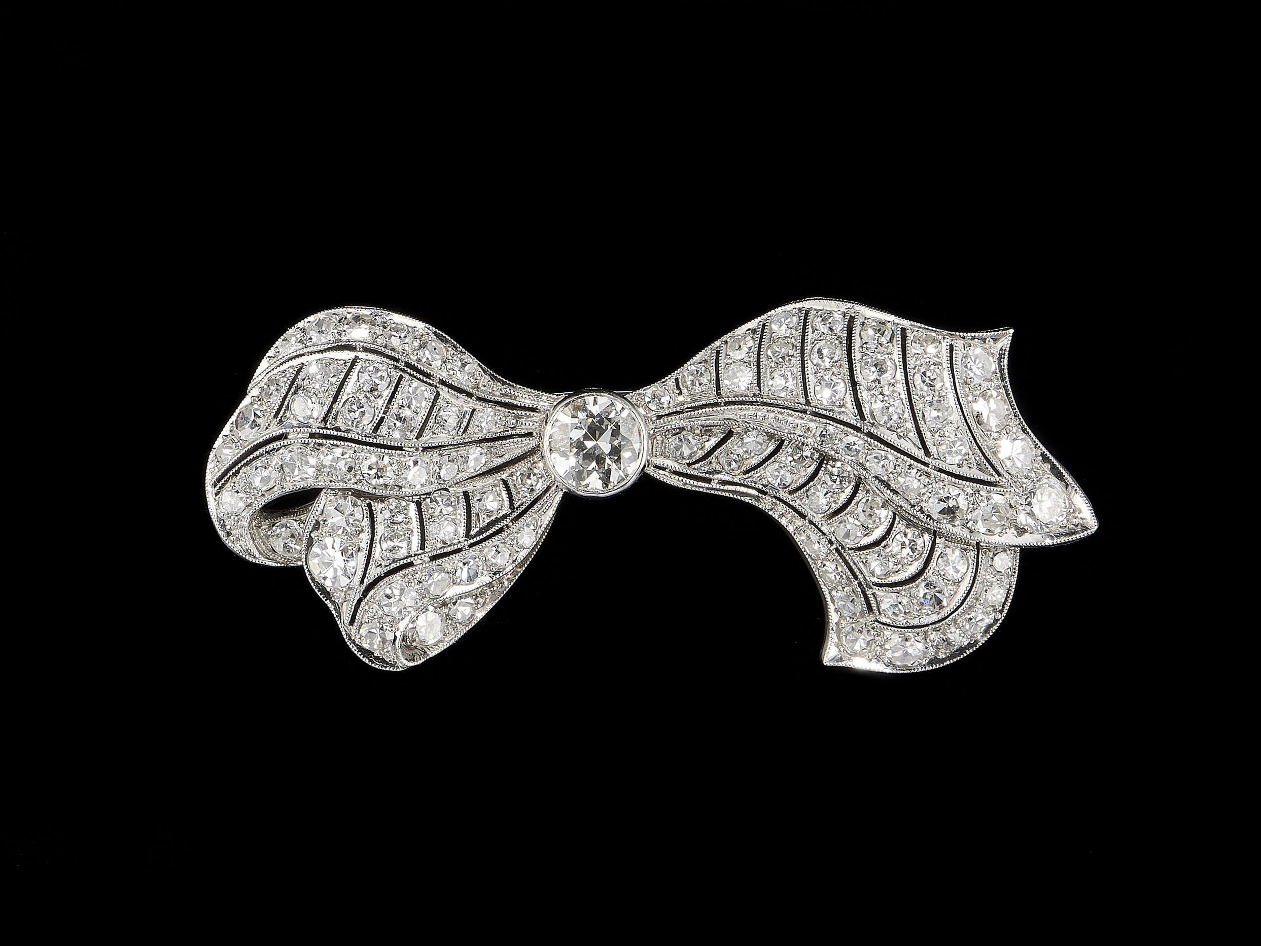 931. Broche nœud centrée d'un diamant (env. 0,3 ct) et pavée de diamants
