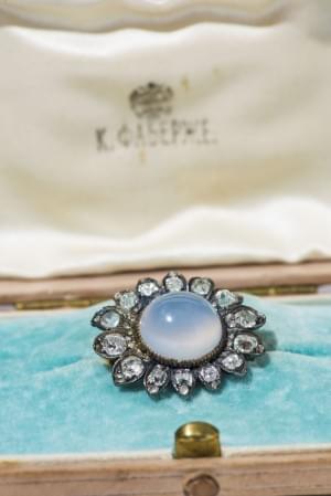 172. Broche ovale sertie d'une pierre de lune entourée de diamants
