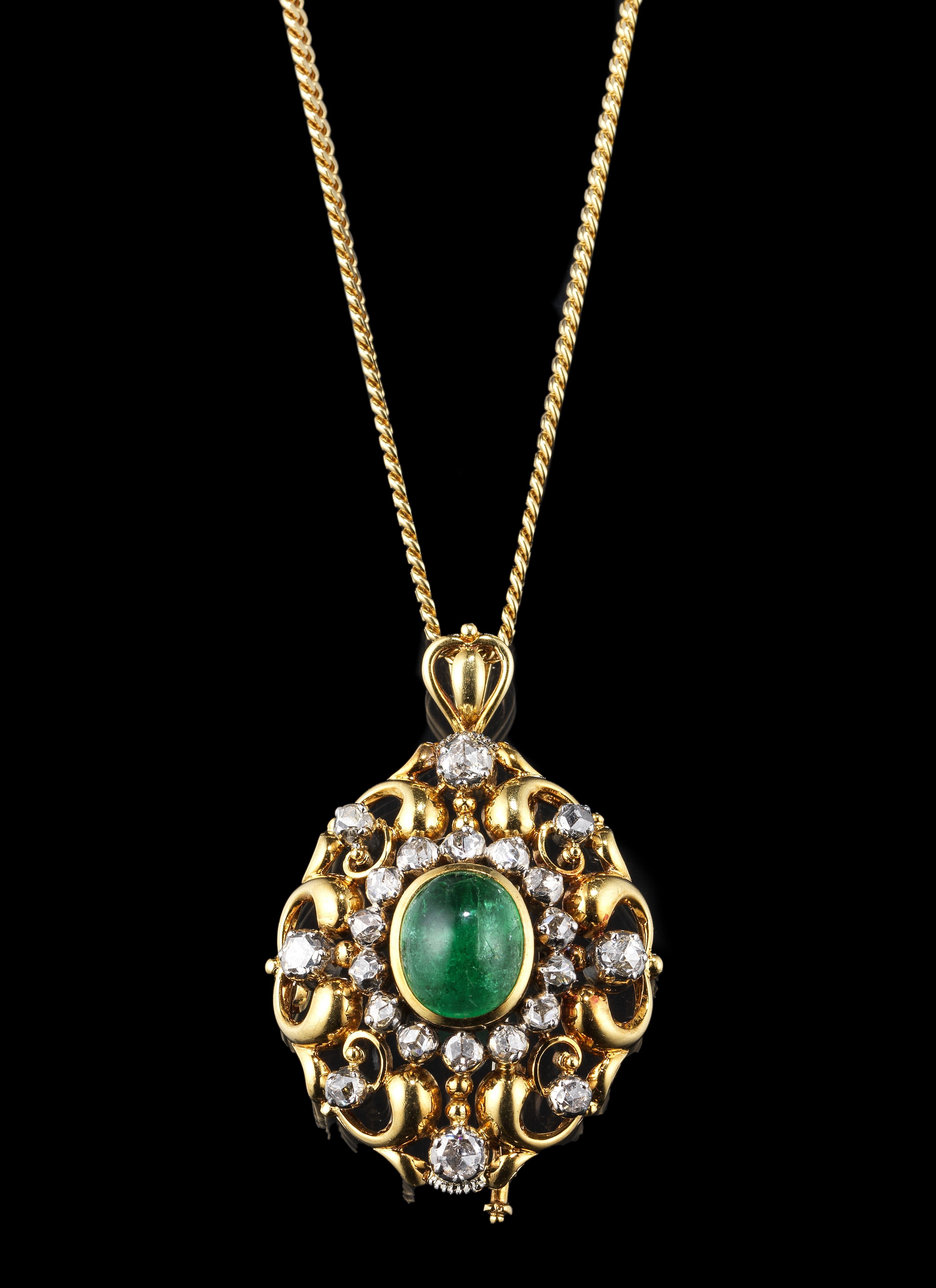 Centrée d'une émeraude taille cabochon entourée de roses de diamant, retenue par une chaîne à maille gourmette, or 750, H 4 cm, L 50 cm, 27 g