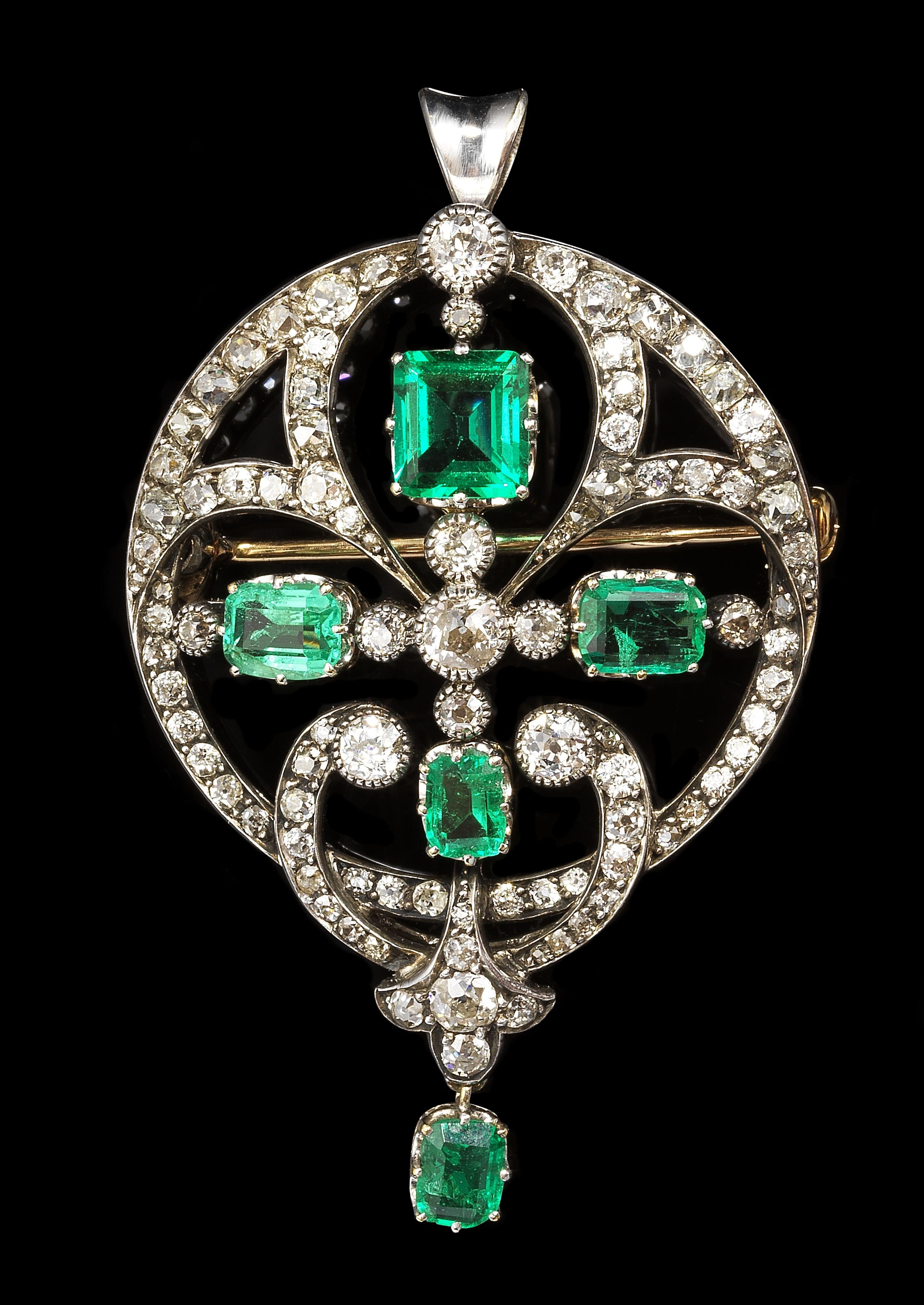 107. Broche-pendentif ajourée à décor de volutes, sertie d'émeraudes taille émeraude et de diamants taille ancienne