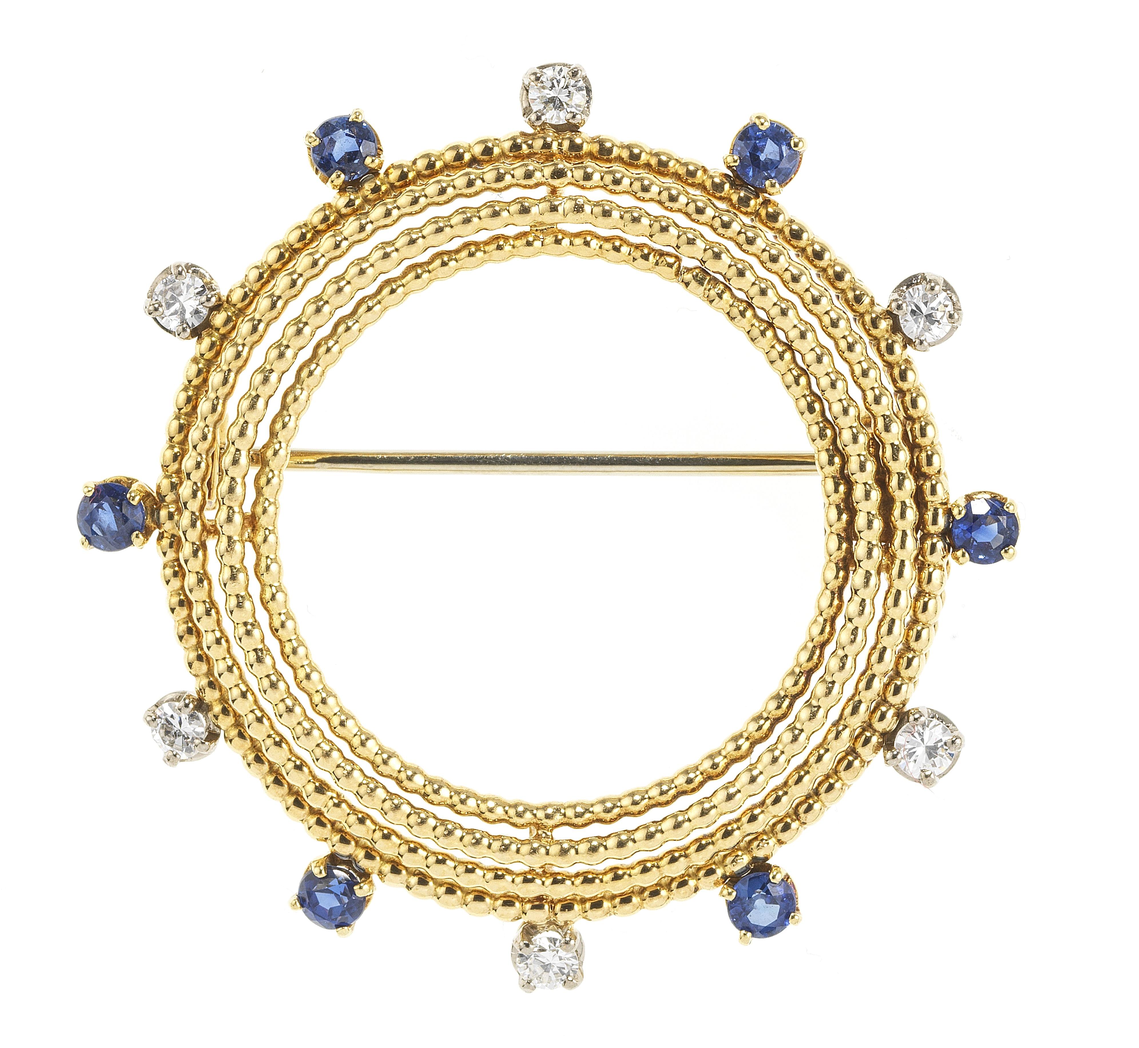 3303. Broche ronde ajourée entourée d'une alternance de saphirs et de diamants