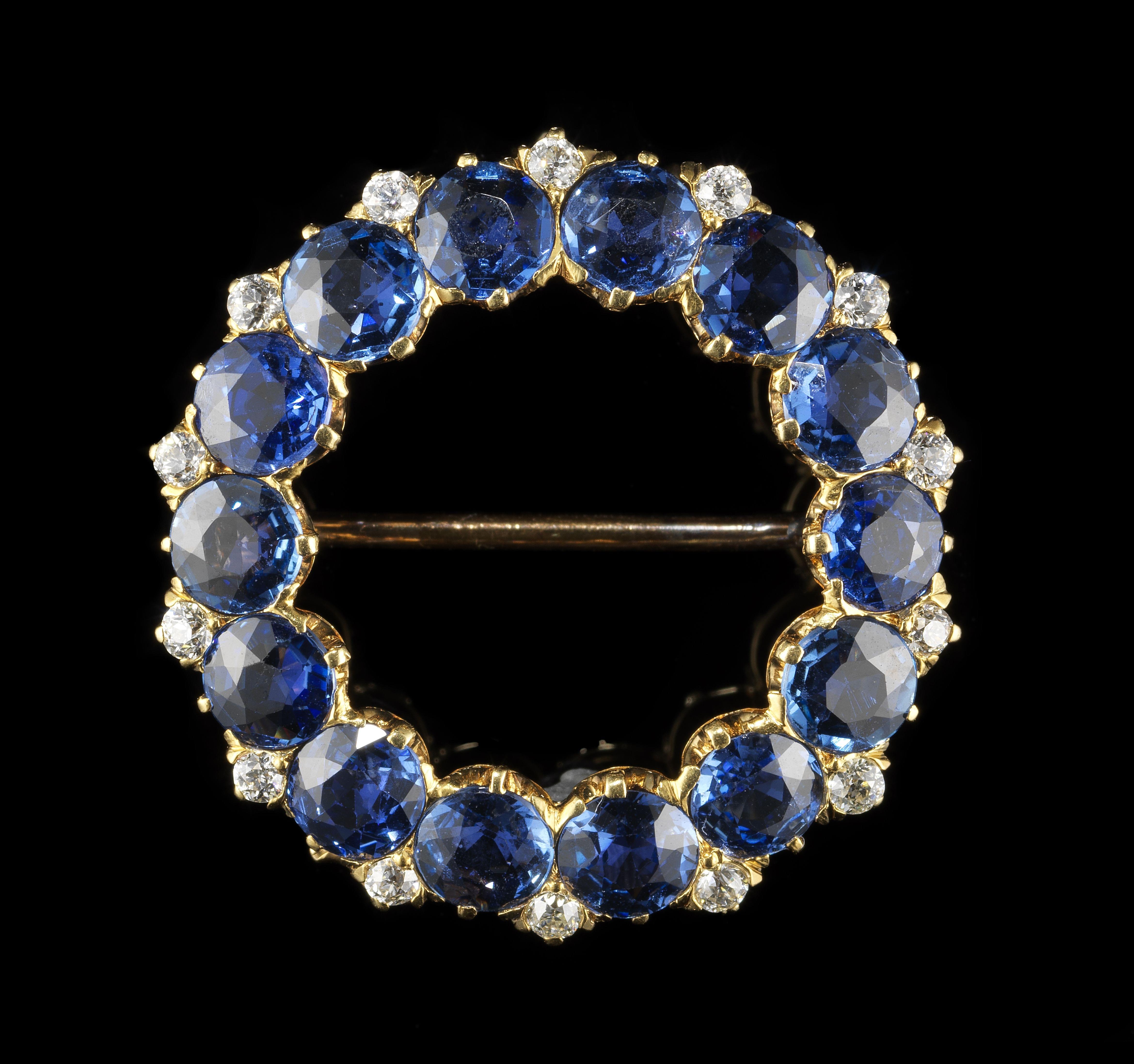 3200. Broche ronde sertie de saphirs taille brillant rehaussés de diamants taille ancienne