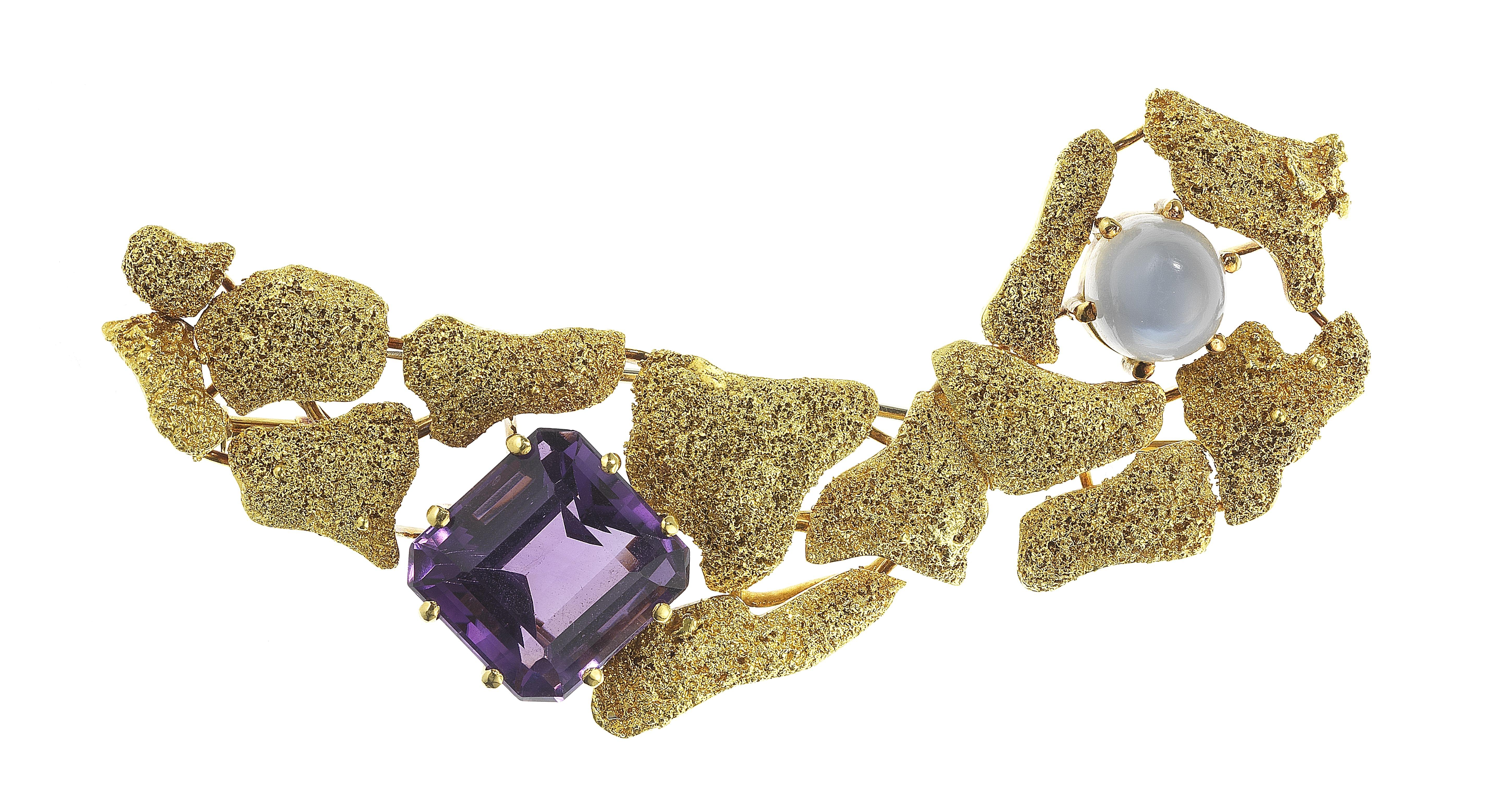 3372. Broche sertie d'une améthyste taille rectangle (env. 4,5 ct) et d'une pierre de Lune en pain de sucre
