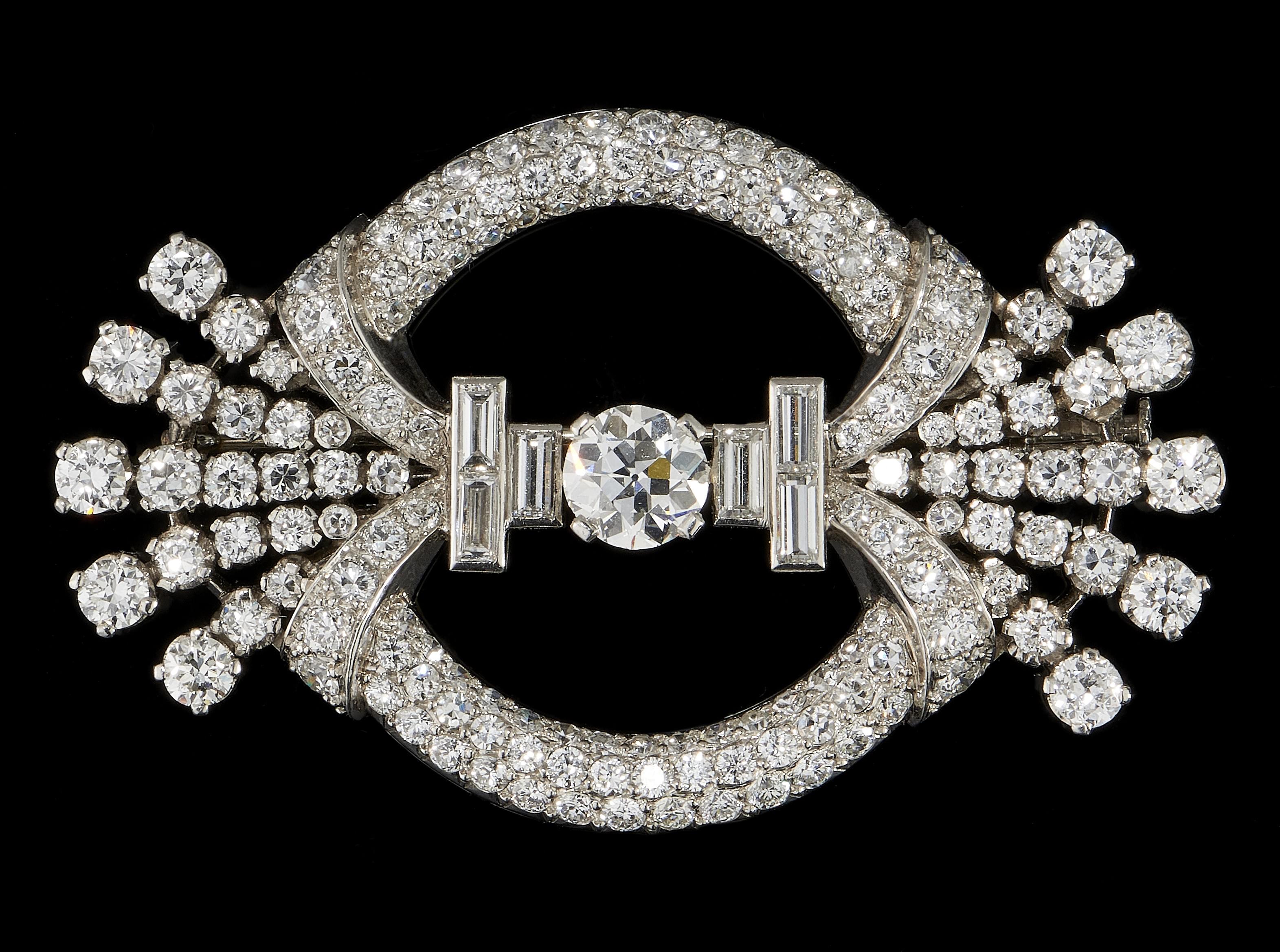 990. Broche sertie d'un diamant taille ancienne (env. 1.4 ct) et pavée de diamants (env. 8 ct)