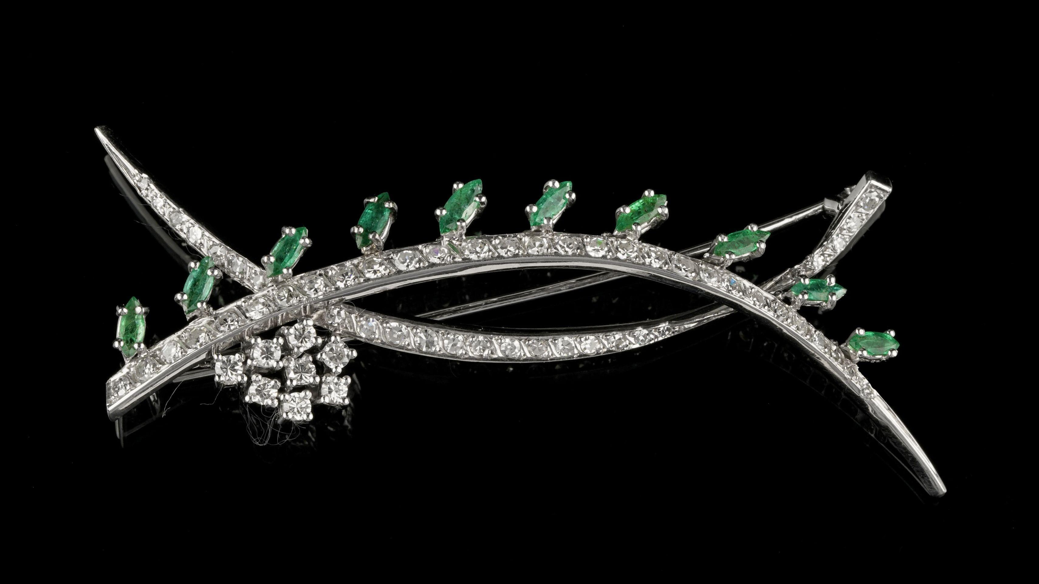 673. Broche stylisée sertie de diamants et d'émeraudes