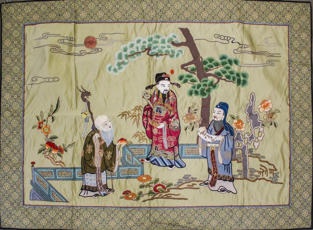Soie figurant Lu Xing (richesse), Shou Xing (longévité) et Fu Xing (bonheur), Chine, 81x118 cm
