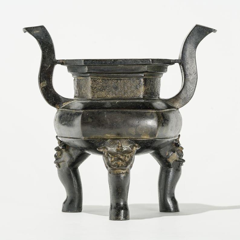 Bronze, figures de créatures animales sur chacun des trois pieds, 23x22 cm