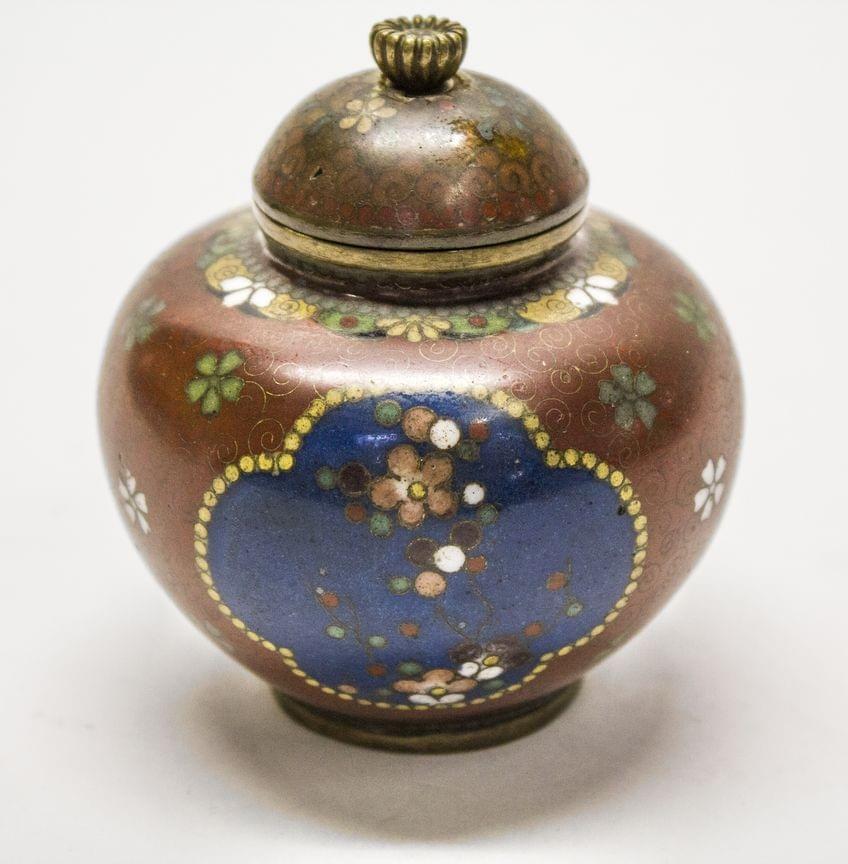 Email cloisonné à décor floral et papillons dans des réserves, Japon, XIXe s, H 8 cm
