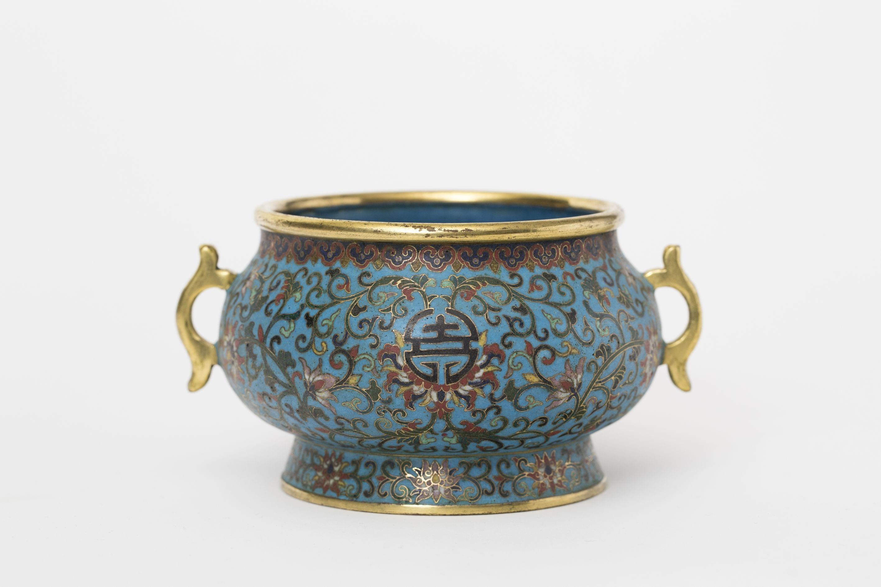 Bronze et émaux polychromes à décor de rinceaux et fleurs sur fond bleu, D 12 cm