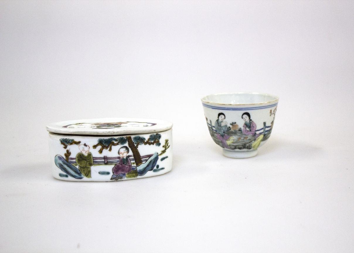 Porcelaine à décor de personnages et poème, L 11 cm et H 6 cm