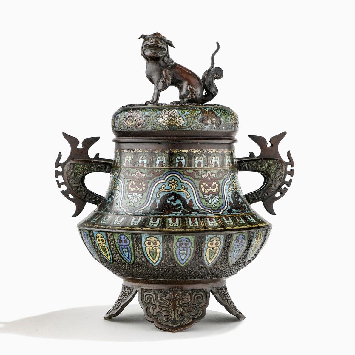 Bronze à décor d'émaux cloisonnés, anses latérales et frétel en chien de fô, H 36 cm