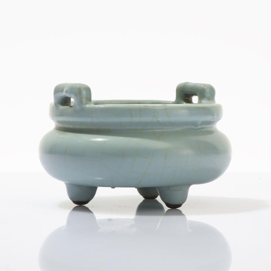 141. Saleron tripode à motifs de rinceaux et perlettes turquoise en é...