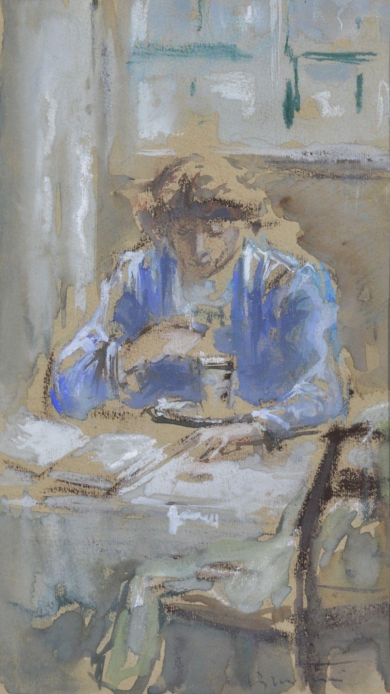 Femme attablée, gouache et aquarelle sur papier, signée, 22x13 cm