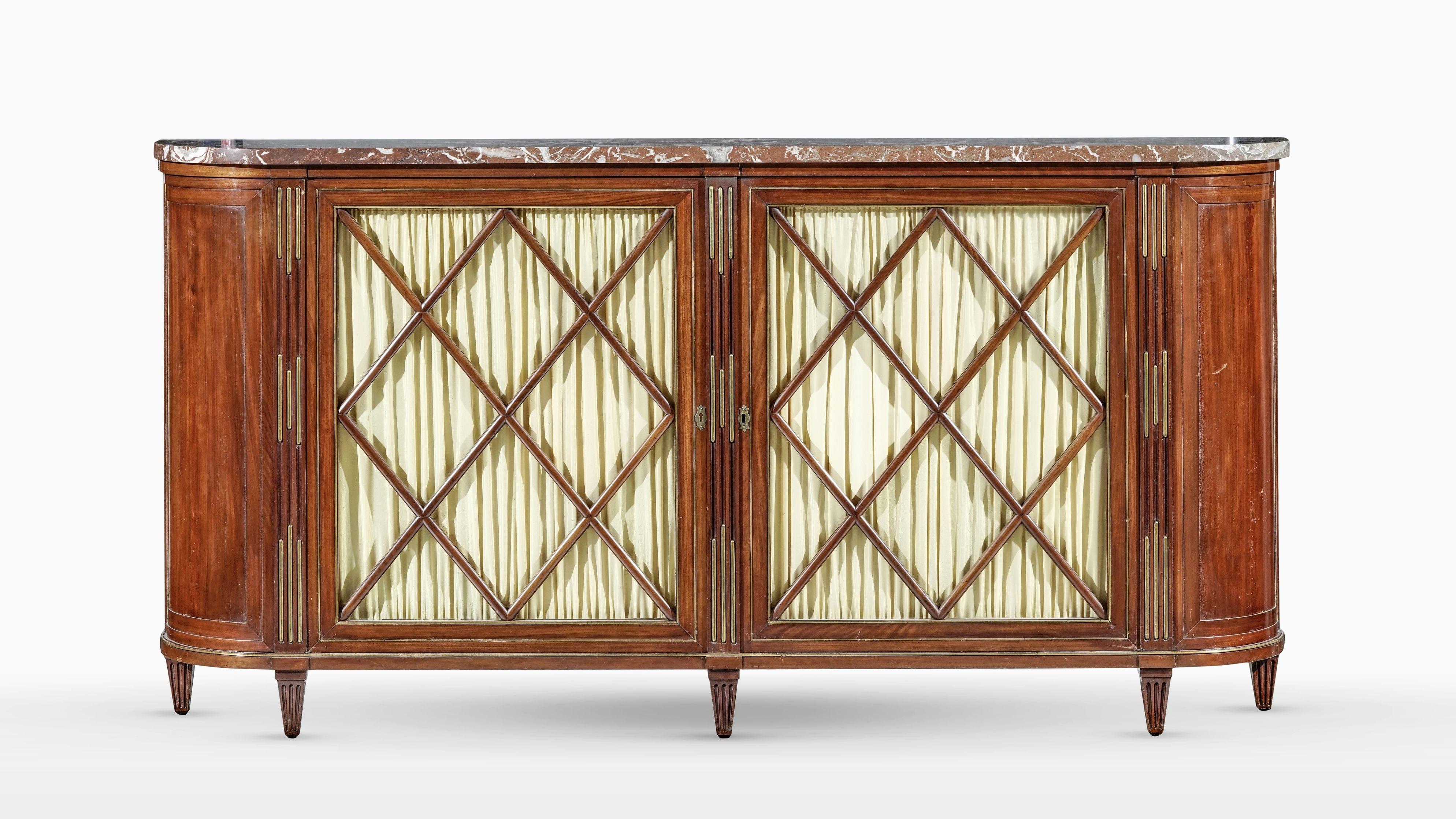 Deux vantaux à croisillons, acajou et filets de laiton, marbre rouge, 108x210x33 cm