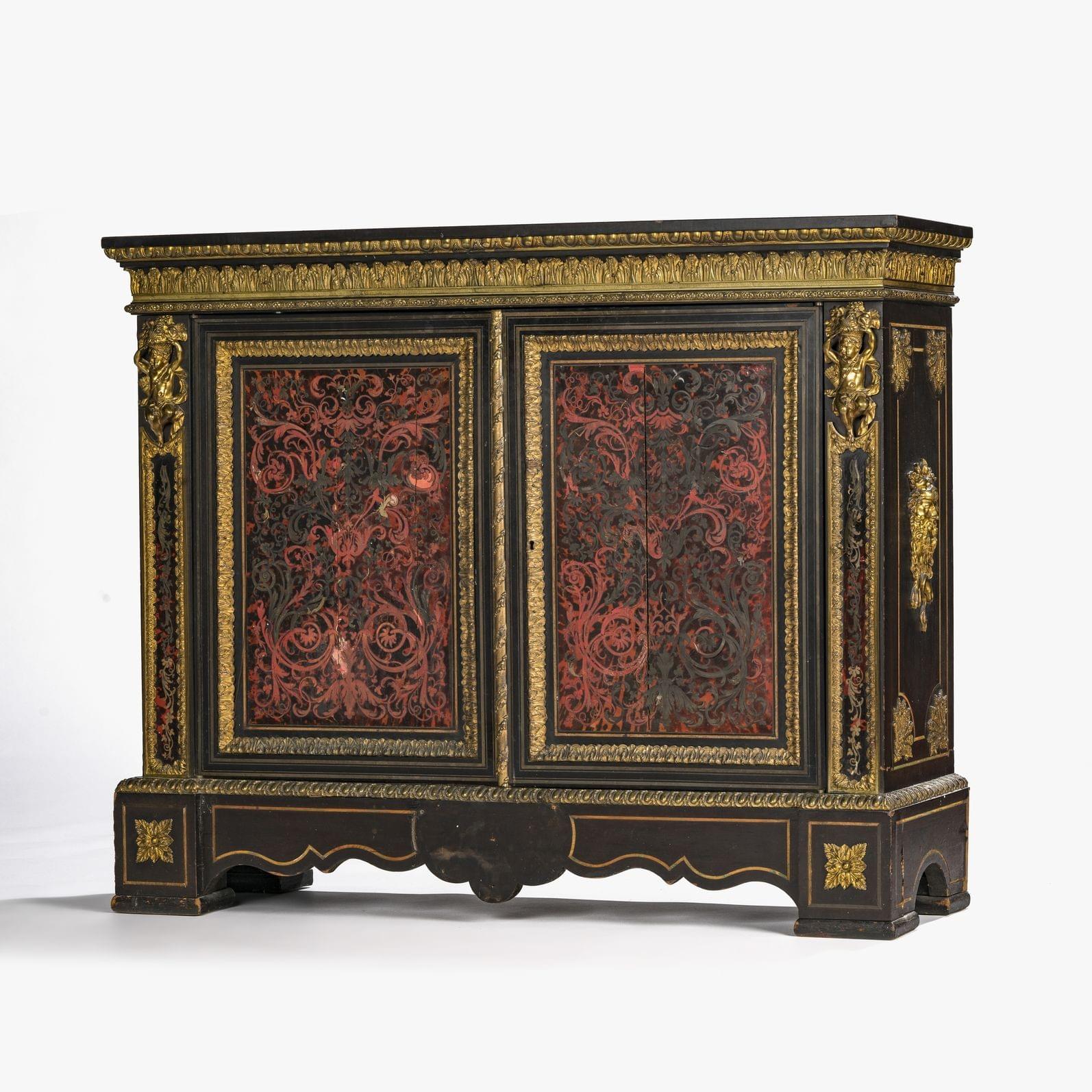 Deux vantaux à décor de rinceaux en laiton sur fond d'écaille, poirier, bronze doré, 94x120x34 cm