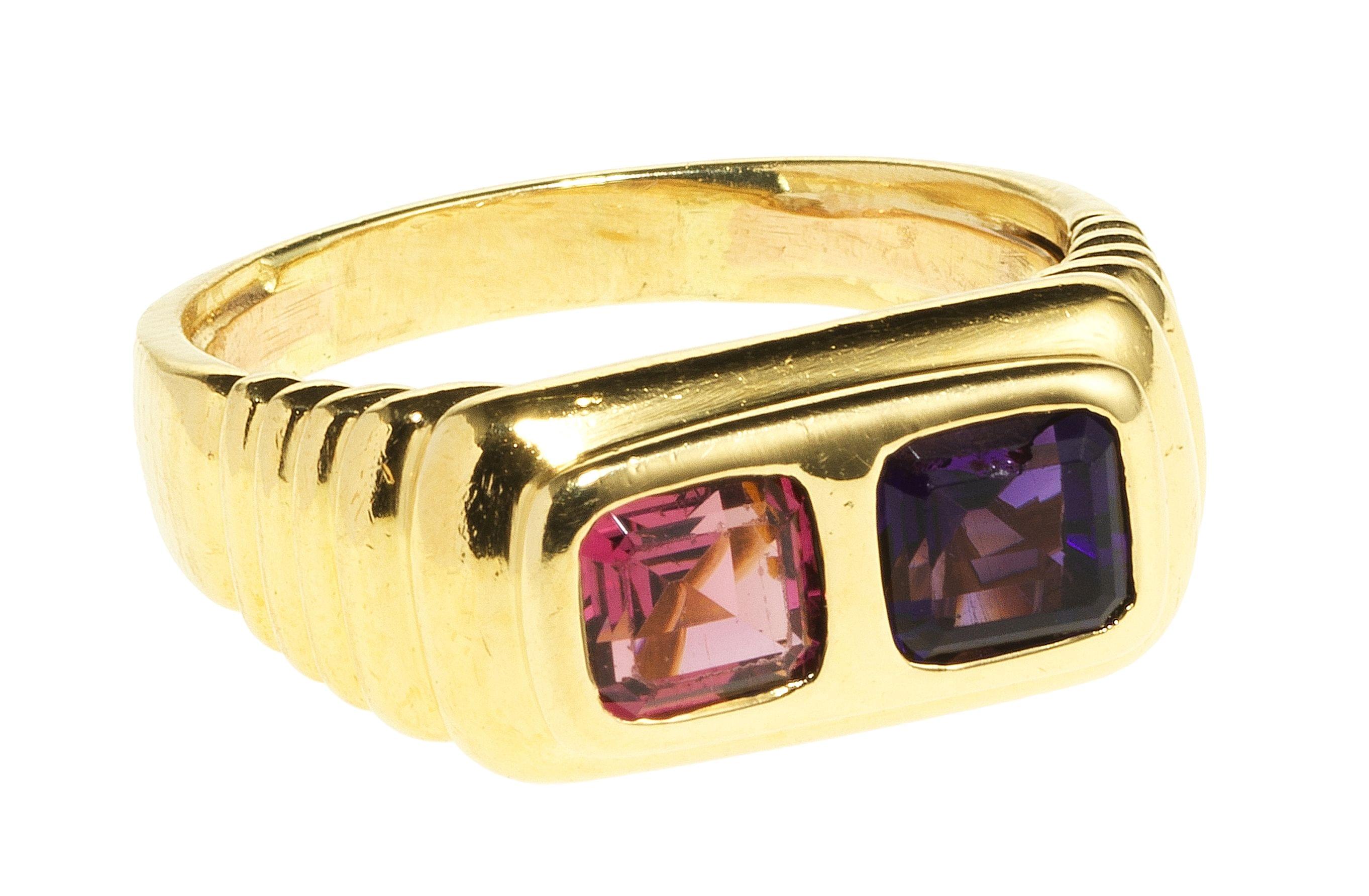 3443. Bulgari, bague sertie d'une améthyste et d'une tourmaline rose octogonales sur une monture godronnée