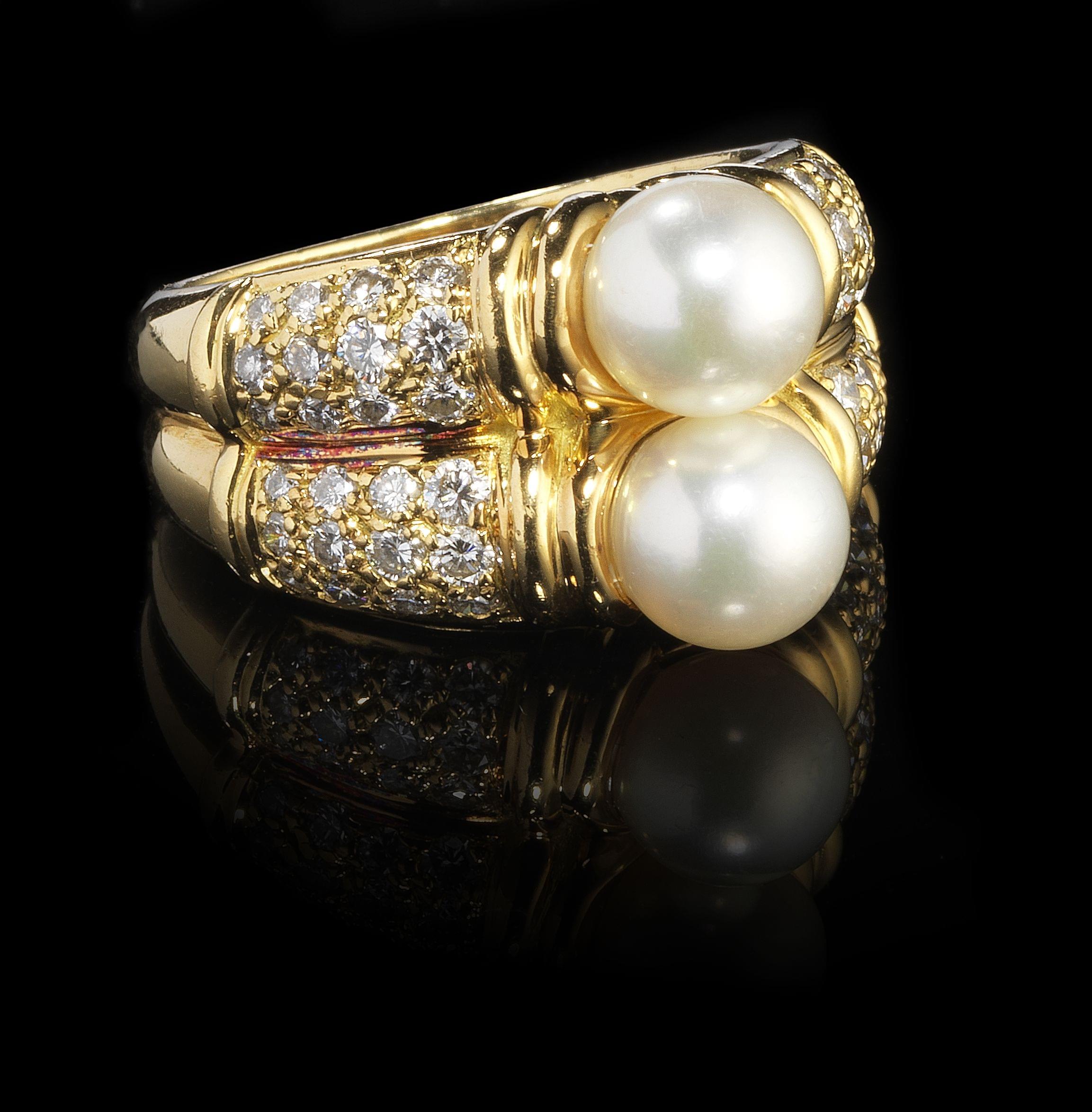196. Bulgari, bague sertie de deux perles (D env. 6,5 mm) épaulées de pavages de diamants