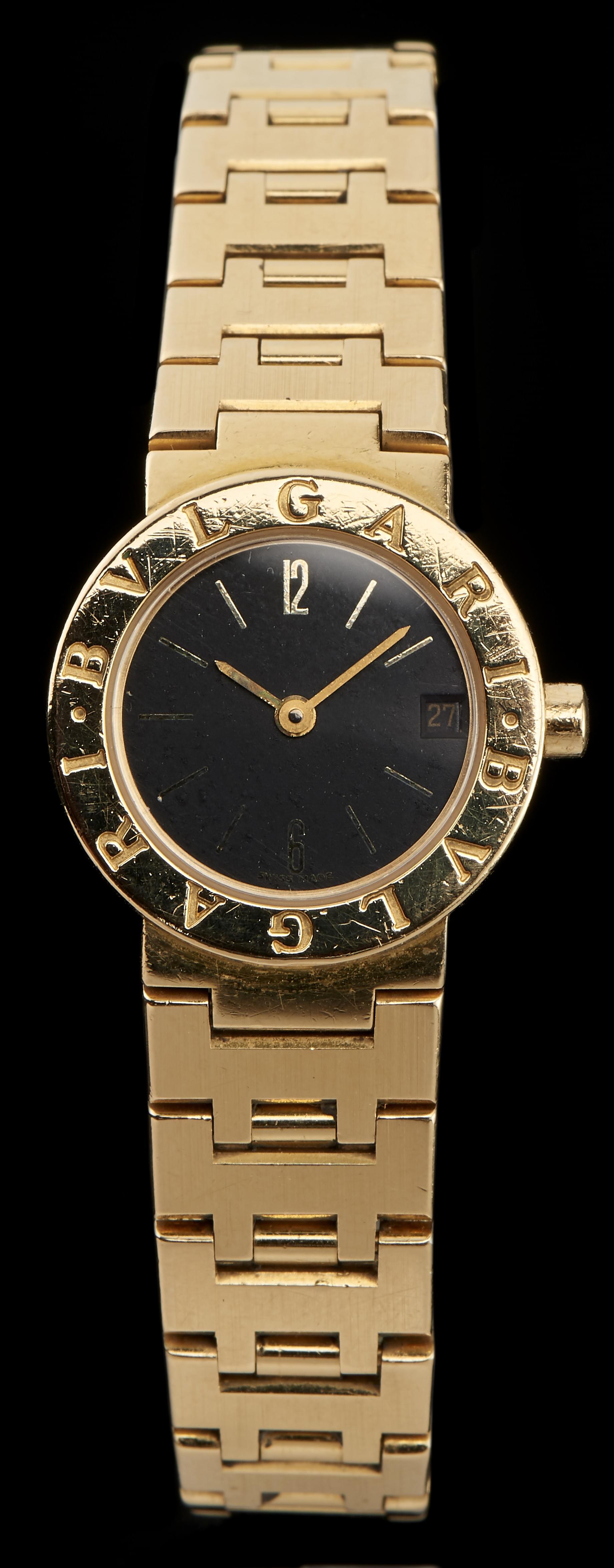 Cadran noir, aiguilles dorées, index bâtons et chiffres arabes dorés, date à guichet à 3h, or 750, D 23 mm, 77 g, dans son écrin