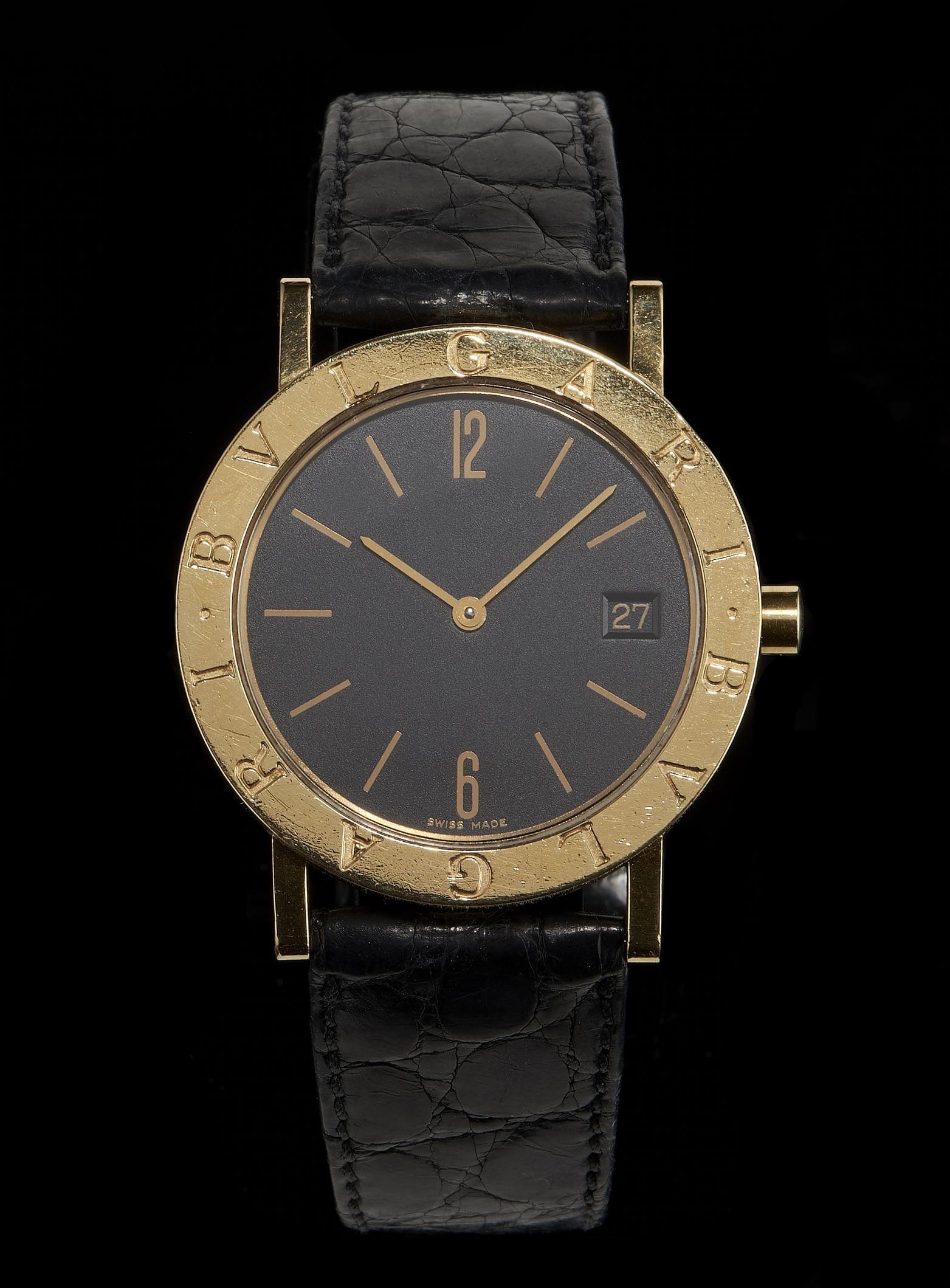 Cadran noir, aiguilles dorées, chiffres arabes et index bâtons dorés, date à guichet à 3h, or 750, D 33 mm, poids brut 44 g