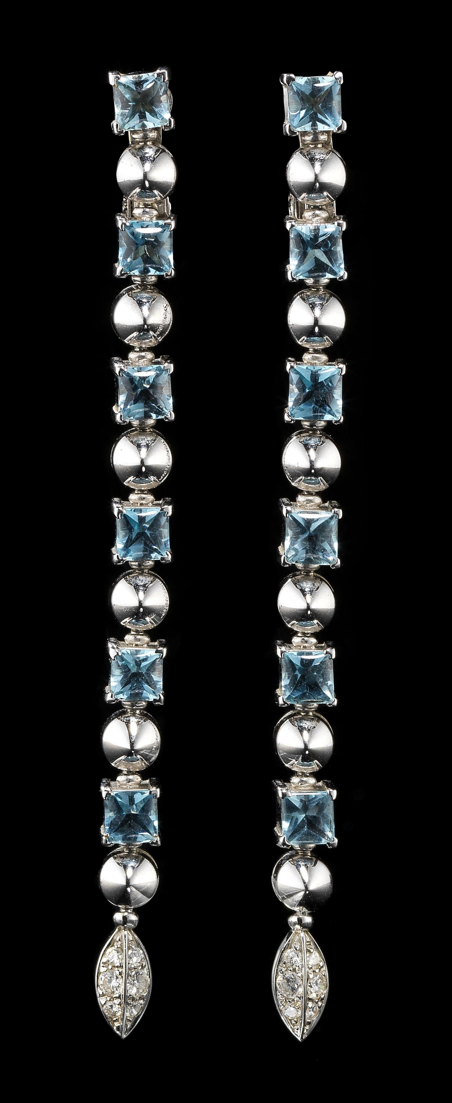 319. Bulgari, paire de pendants d'oreilles sertis de topazes bleues taille suiffée et terminée par un motif serti de diamants