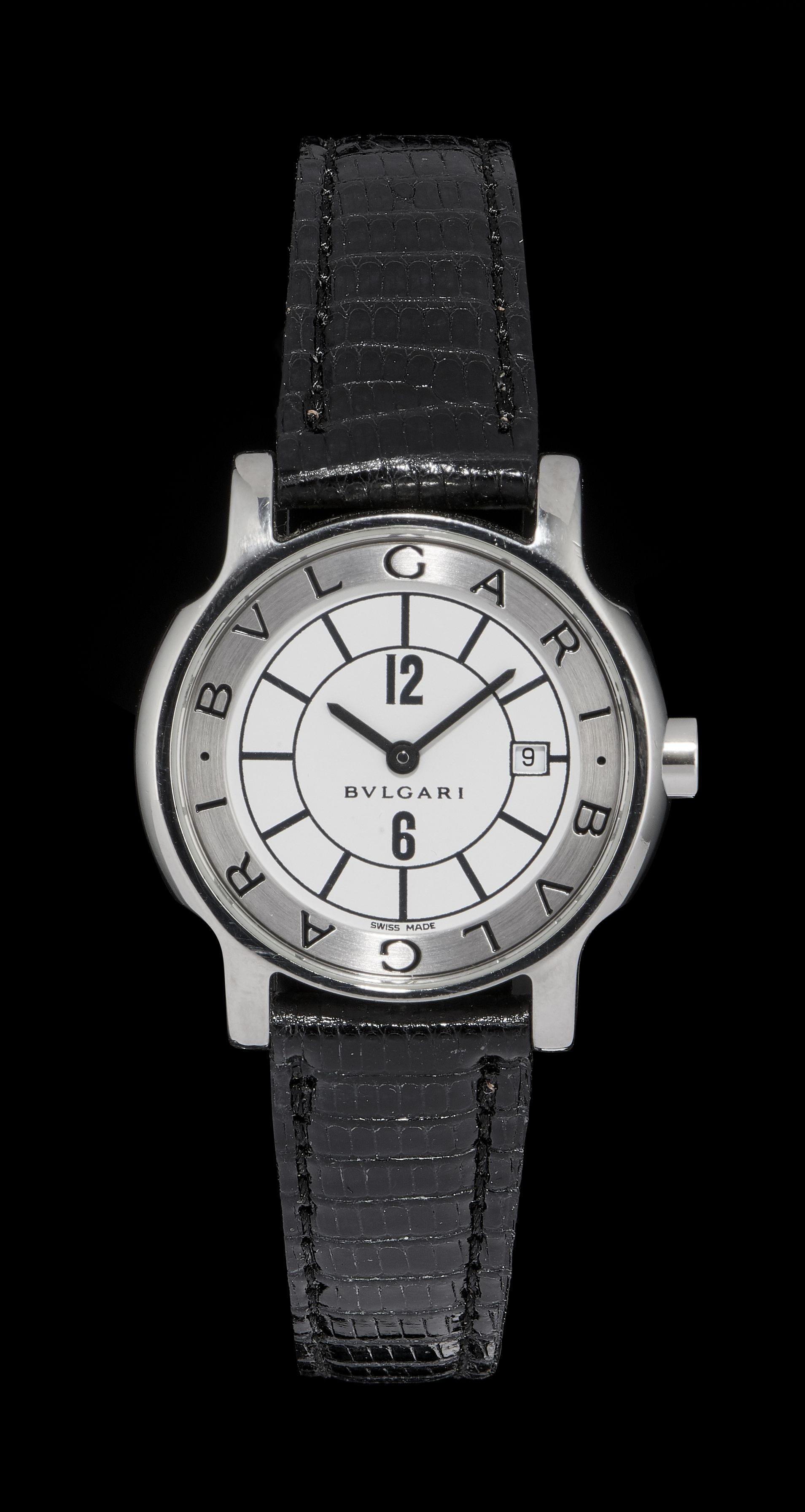 Cadran blanc, aiguilles et chiffres romains noirs, date à guichet à 3h, acier, D 28 mm