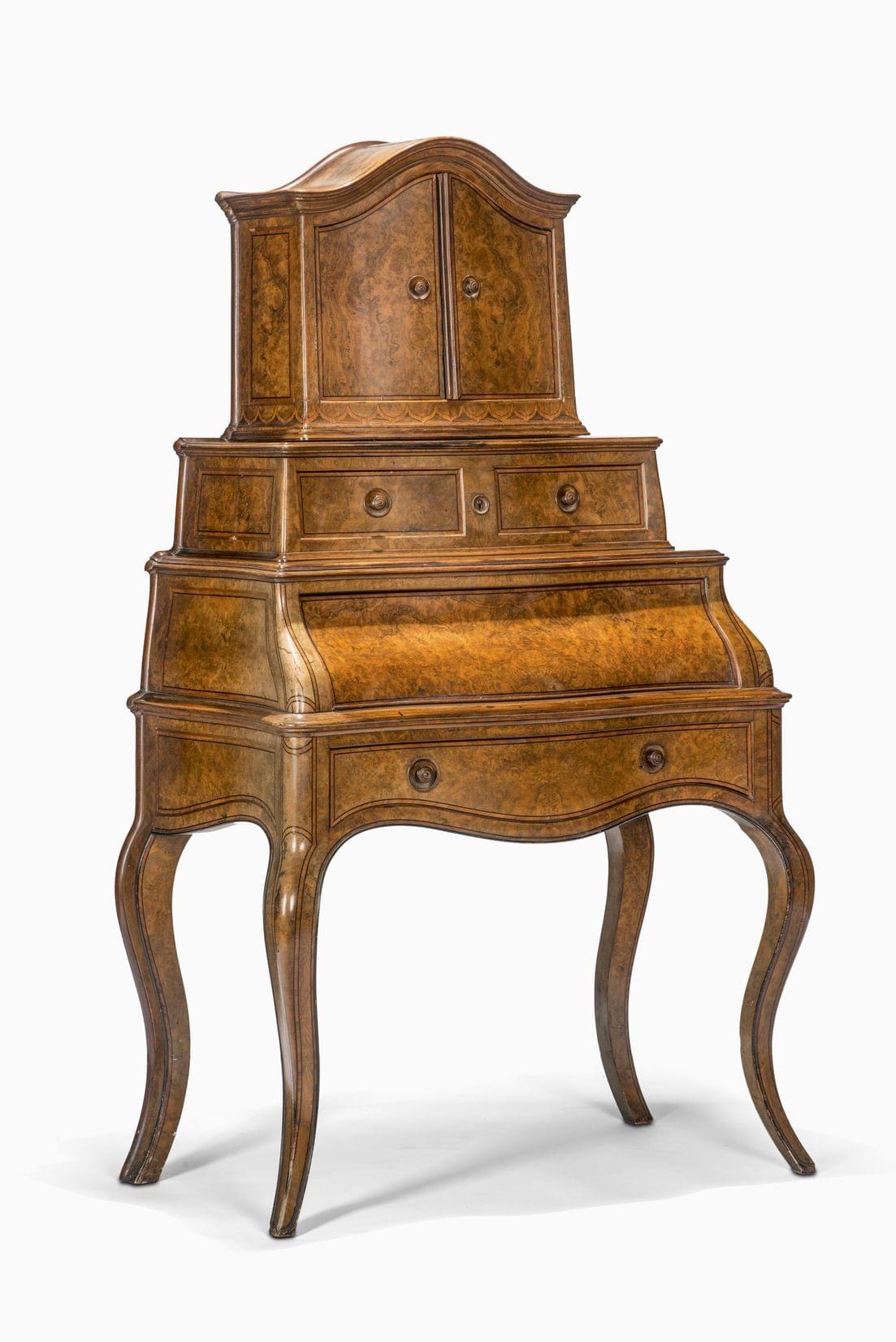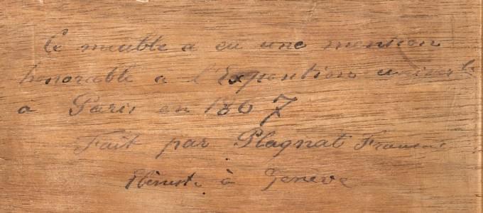 Signé François Plagnat ébéniste à Genève, deux vantaux, trois tiroirs, un abatant, pieds galbés, placage de ronce de noyer dans des encadrements de filets. 160x54x90 cm. Ce meuble a reçu une mention honorable à l'exposition de 1867.