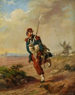 Militaire volant une brebis, huile sur carton, signée, 21x17 cm