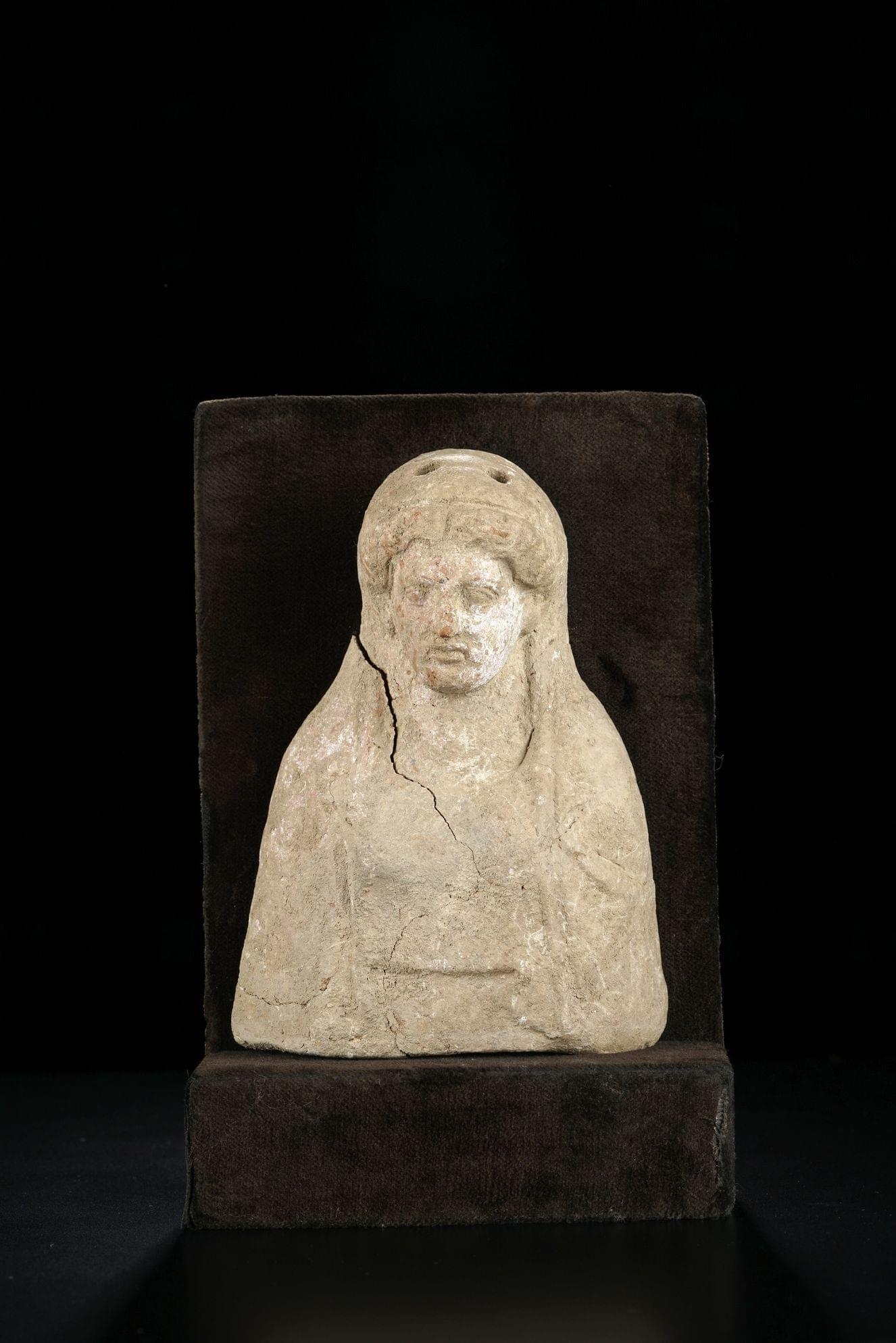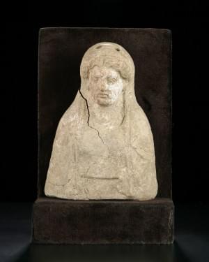 Tenant une grappe dans la main droite, calcaire sculpté, traces...