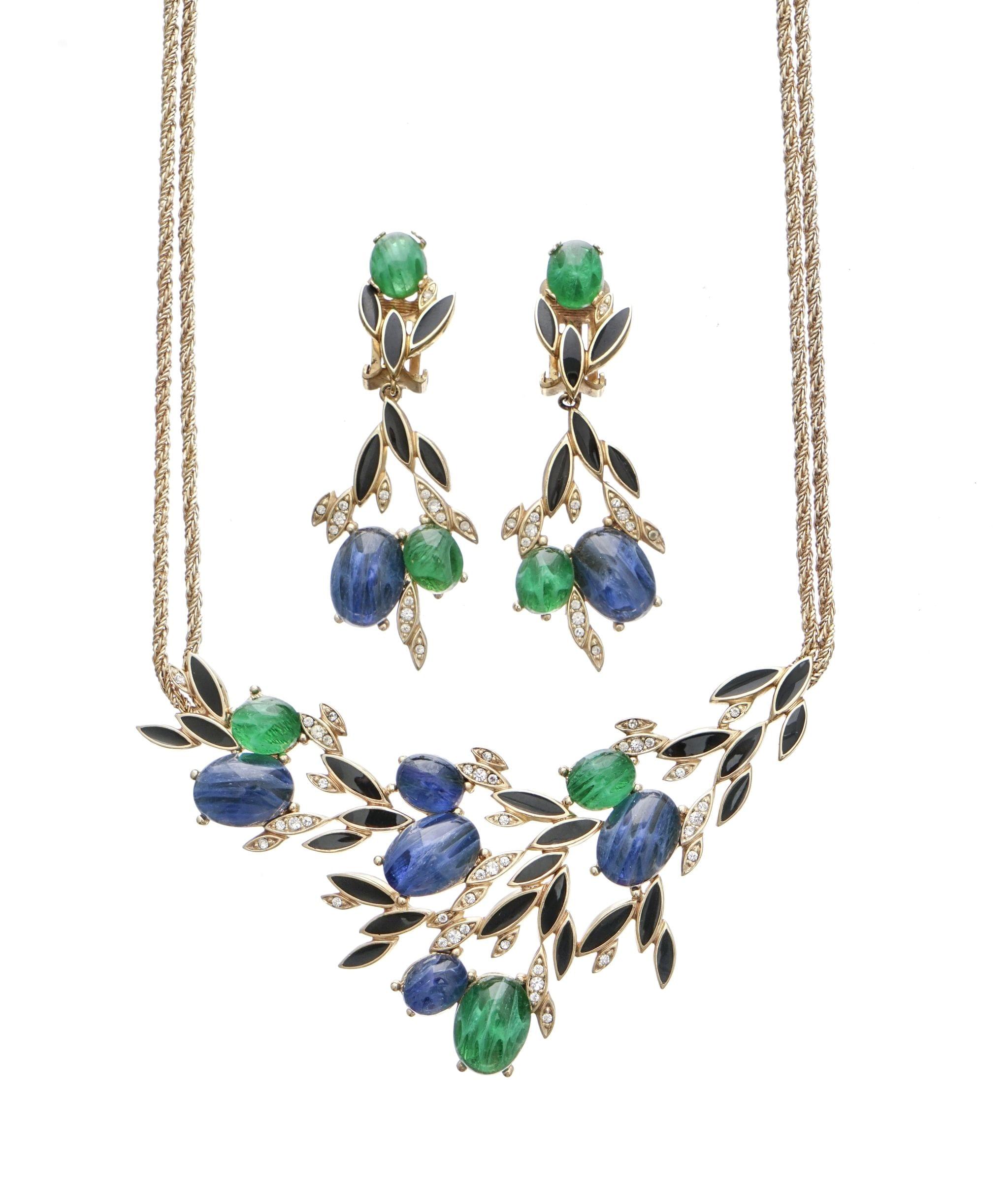 3236. C. Dior, parure composée d'un collier et de clips d'oreilles émaillés sertis de pierres d'imitation vertes et bleues en cabochon rehaussées de diamants d'imitation