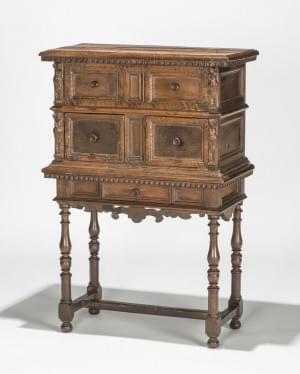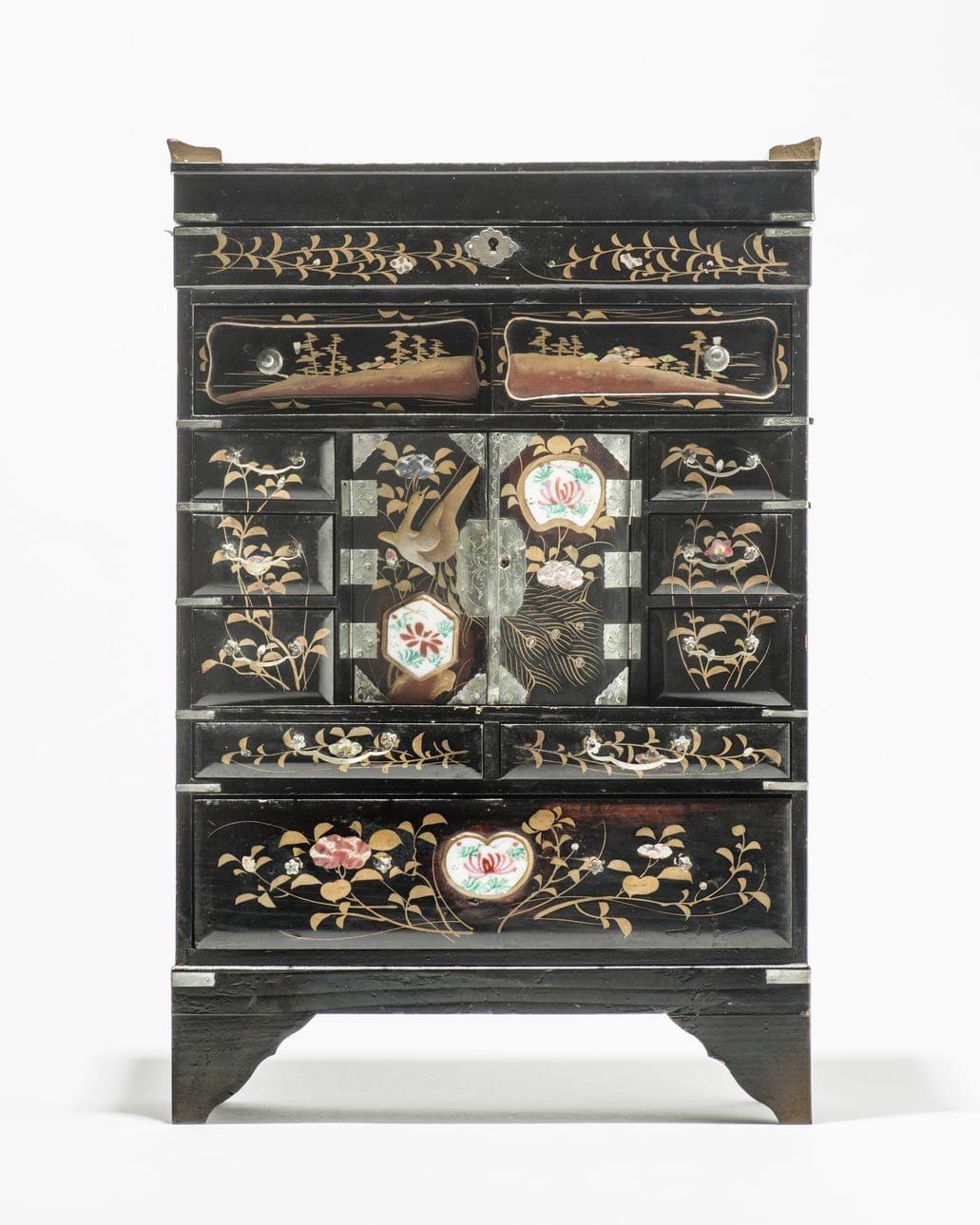 Un abattant en façade démasquant tiroirs et casiers flanqué de q...