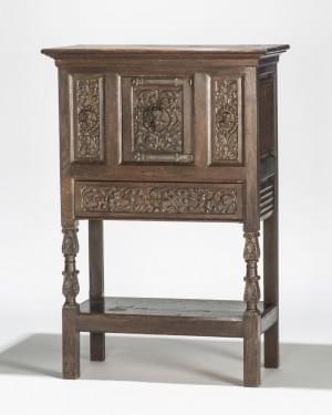 Chêne mouluré et sculpté, fer forgé, dans l'esprit du XVe s, 145...