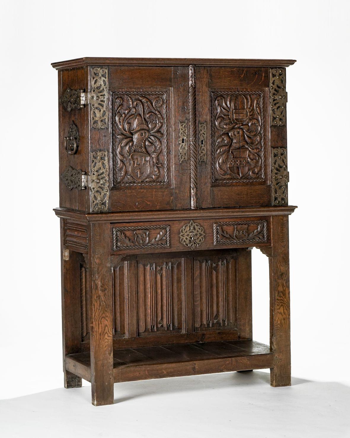 Deux vantaux sculptés d'armoiries et un tiroir, chêne et fer forgé, 151x106x44 cm