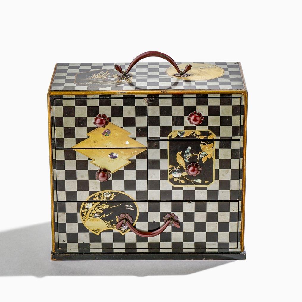 Laque noire, argent et or à motifs de damiers et de scènes en réserve, 19x20,5x10,5 cm