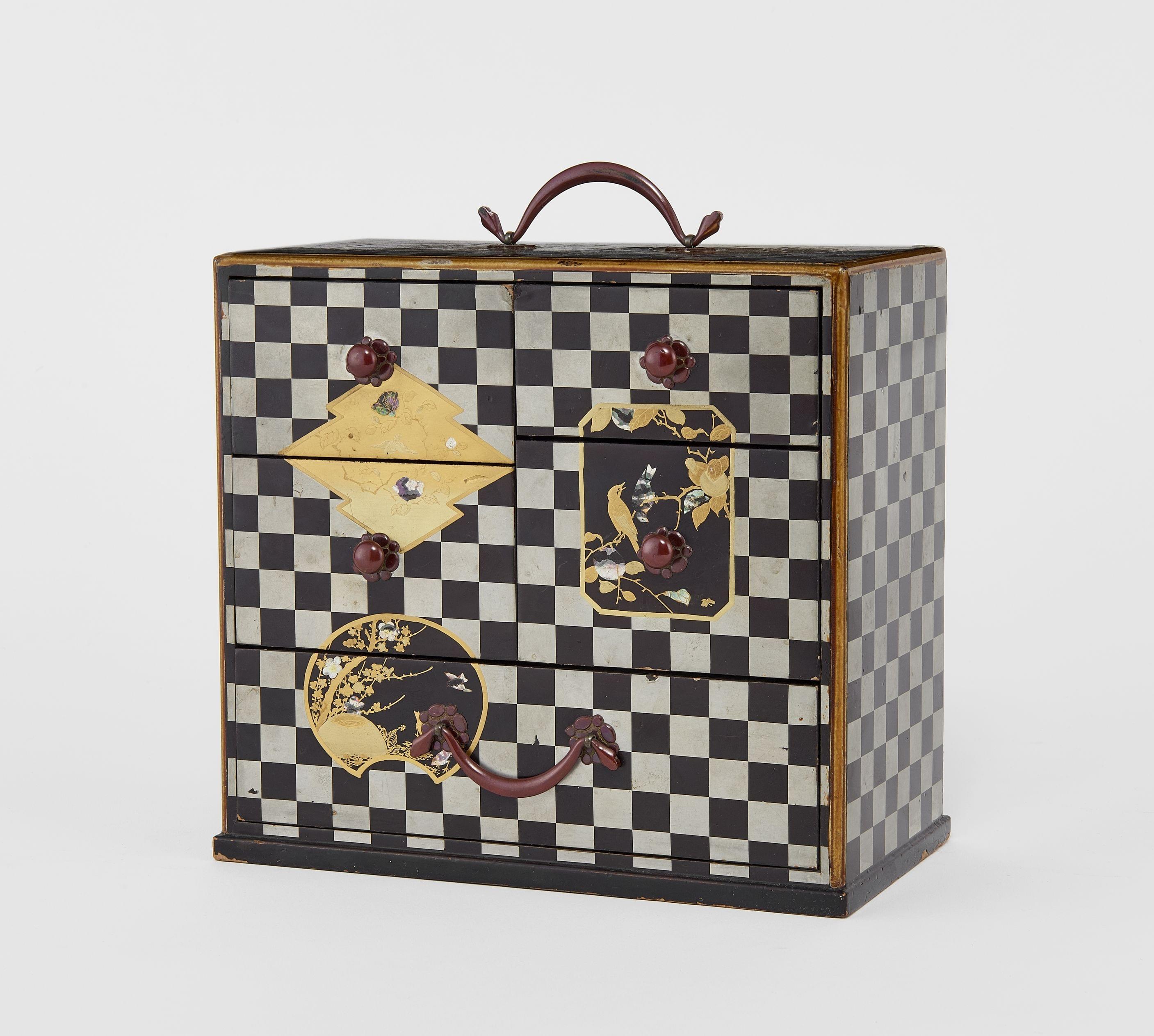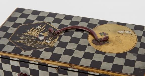 Laque noire, argent et or à motifs de damiers et de scènes en réserves, 19x20,5x10,5 cm