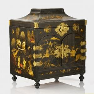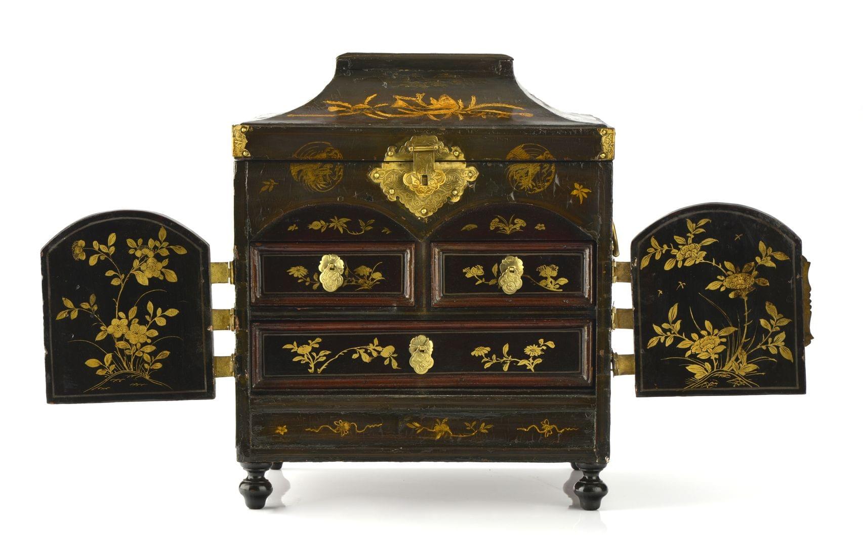 Ouvrant par 9 tiroirs et un abattant, bois laqué noir rouge et o...