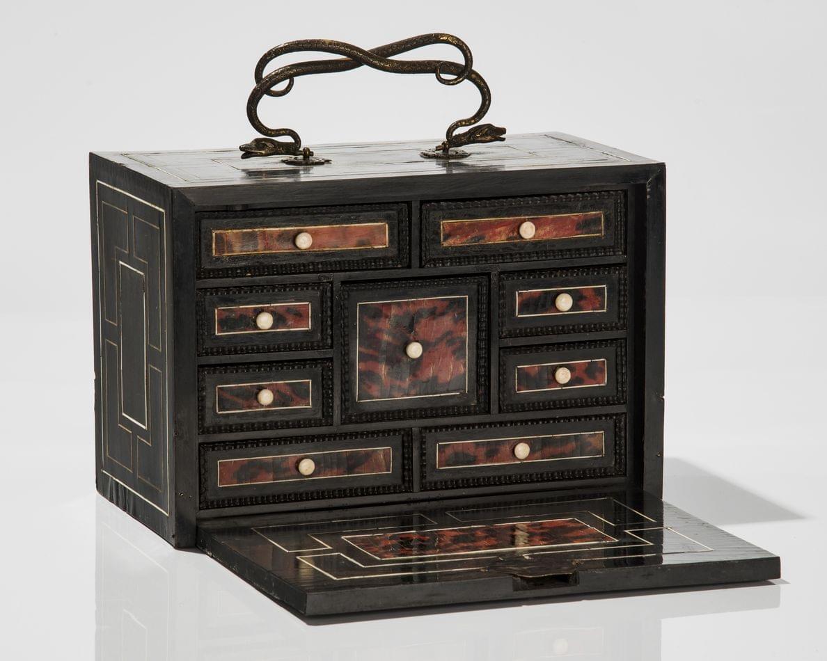 Abattant démasquant des tiroirs, poignée en forme de serpent, bois noirci, filets de laiton, écaille rouge et ivoire, 17x24x13