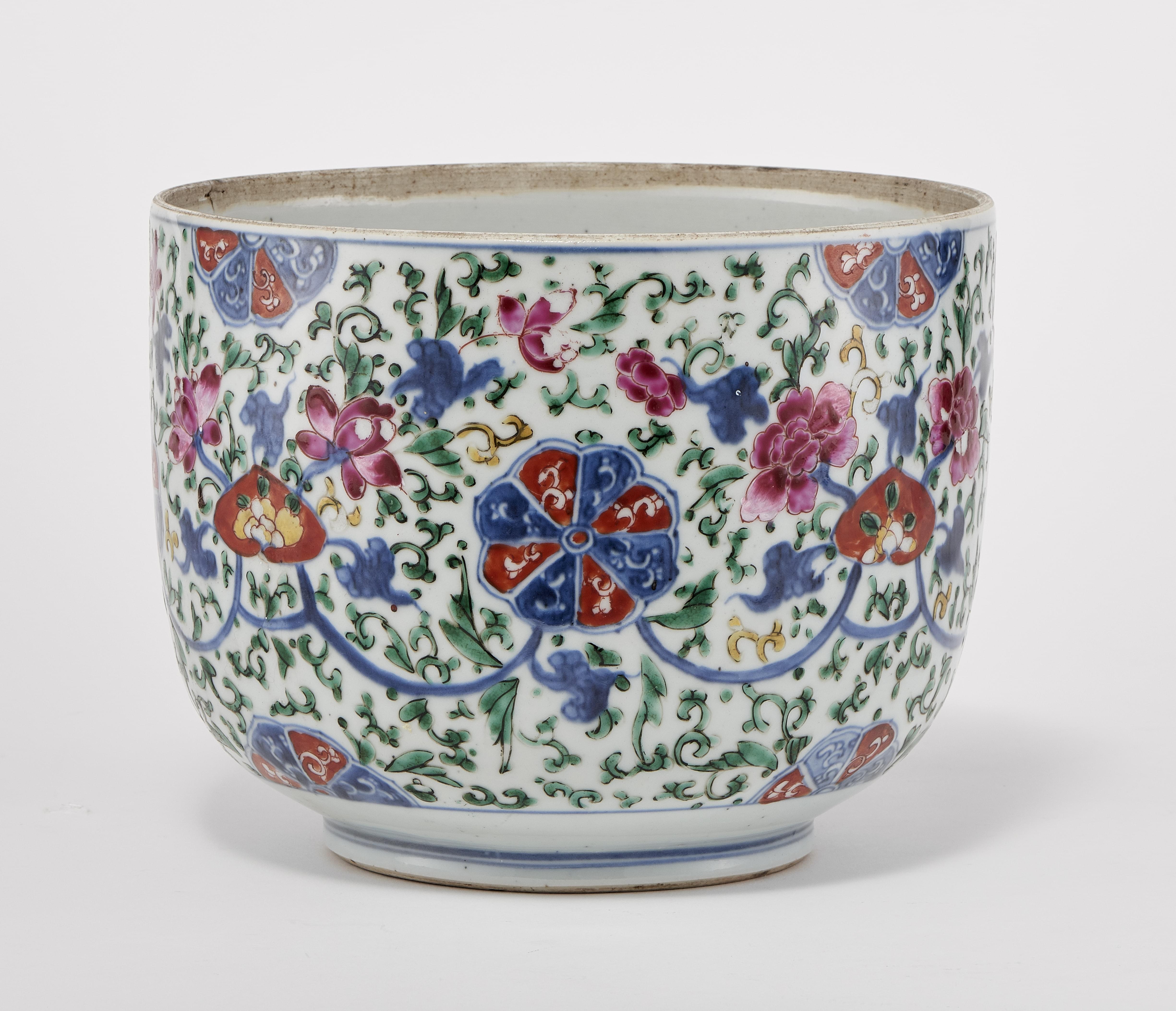 Porcelaine émaillée polychrome à décor de fleurs sur fond de rinceaux, H 16 cm