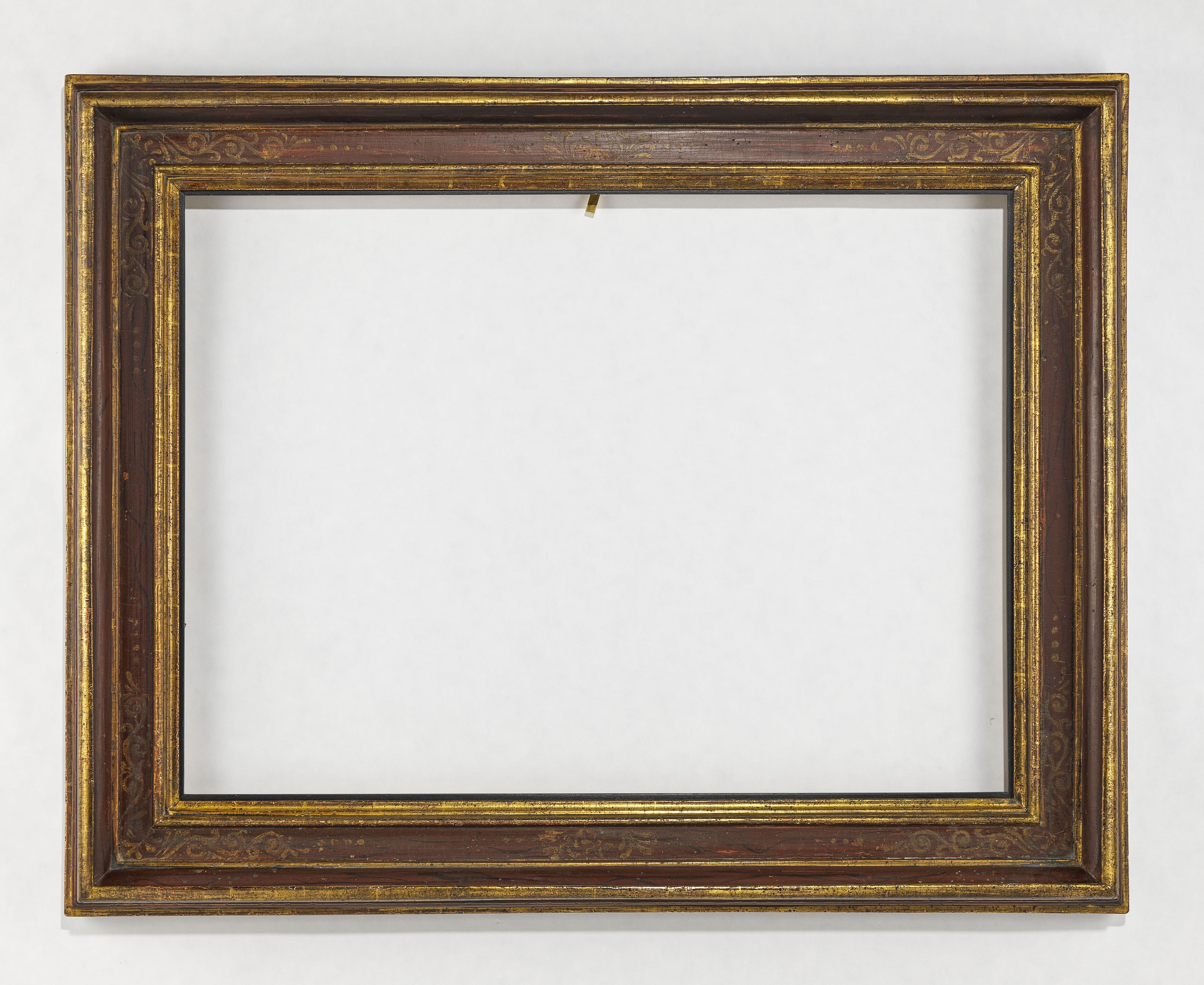 Bois doré et laqué rouge, à motif marbré, 121x96 cm et à la vue 95,5x69,5 cm