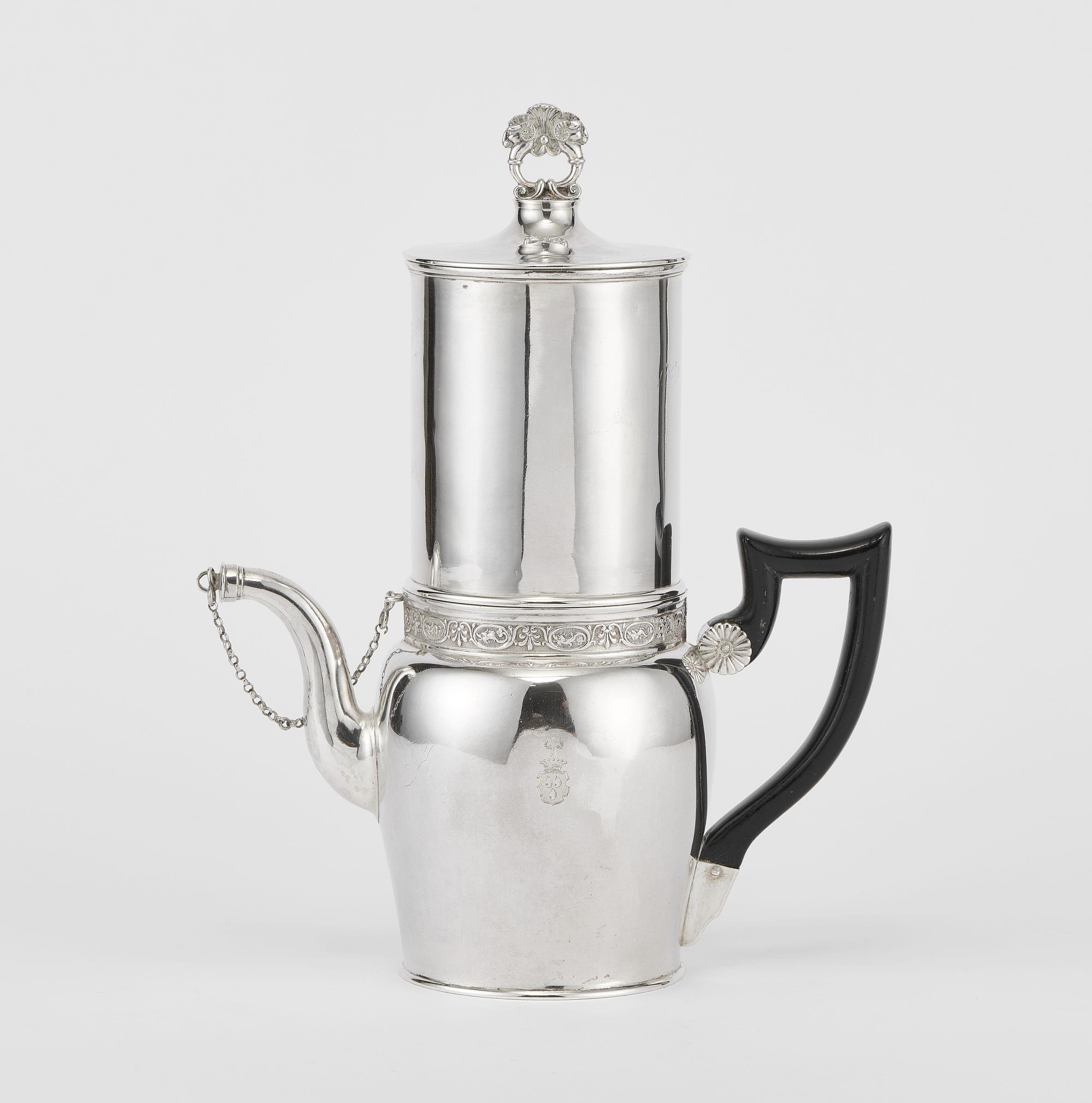 438. Cafetière à décor de frise de palmettes et dauphins et fretel tête de bélier, armoriée Watteville,